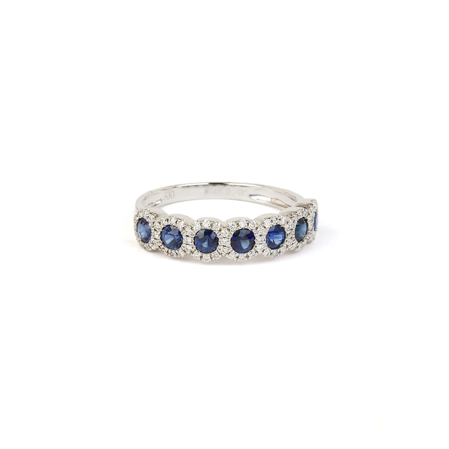 14k white gold ring with sapphire stones which amount to 0.80 carat TW, and diamonds which amount to approximately 0.20 carat TW (SI1-I1 clarity/G-H-I color). Fits a size 7 finger, measures 5mm wide across the top, and weighs 2.5 grams.