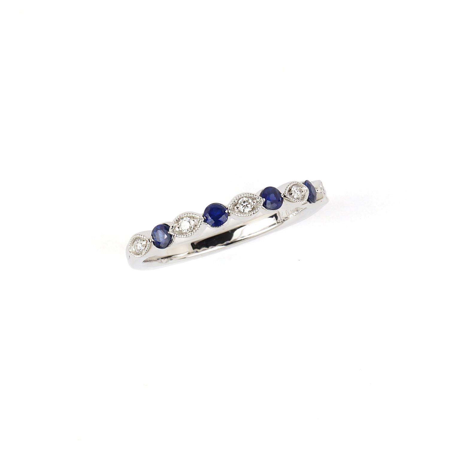 14k white gold ring with 0.30 carat TW 3mm sapphire stones and diamonds which amount to approximately 0.08 carat TDW (SI1-I1 clarity/G-H-I color). Fits a size 7 finger, measures 3mm wide across the top, and weighs 2.3 grams.