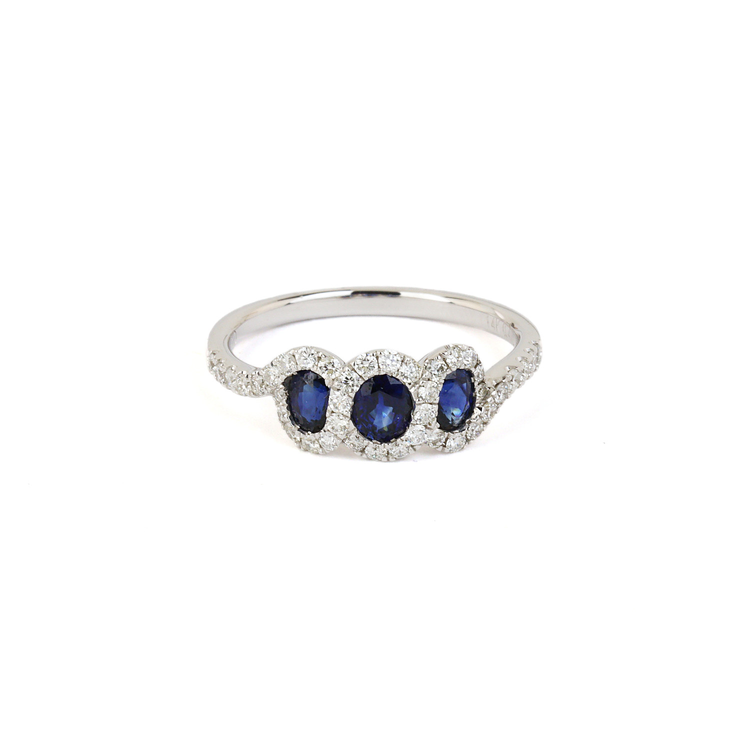 14k white gold ring with 0.91 carat TW sapphire stones and diamonds which amount to approximately 0.41 carat TW (SI1-I1 clarity/G-H-I color). Fits a size 7 finger, measures 7mm wide across the top, and weighs 2.5 grams.