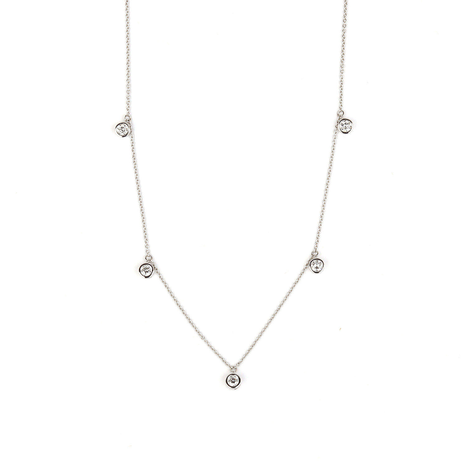 14k white gold station necklace containing dangling diamonds which amount to approximately 0.55 carat TW (VS2-SI1 clarity/G-H-I color). The pendants measure 6mm tall, 4mm at the widest, the chain is 17″ long, and weighs 2.3 grams.