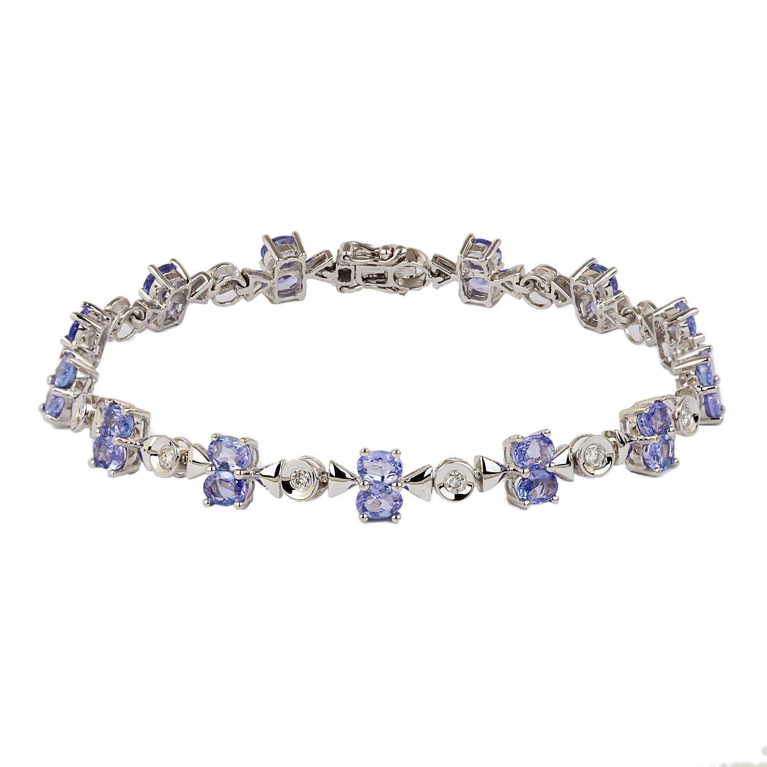 14k white gold bracelet with 4mm tanzanite stones and diamonds which amount to approximately 0.25 carat TW (I1 clarity/G-H-I color). It measures 7″ long, 7mm at the widest, and weighs 10.4 grams.