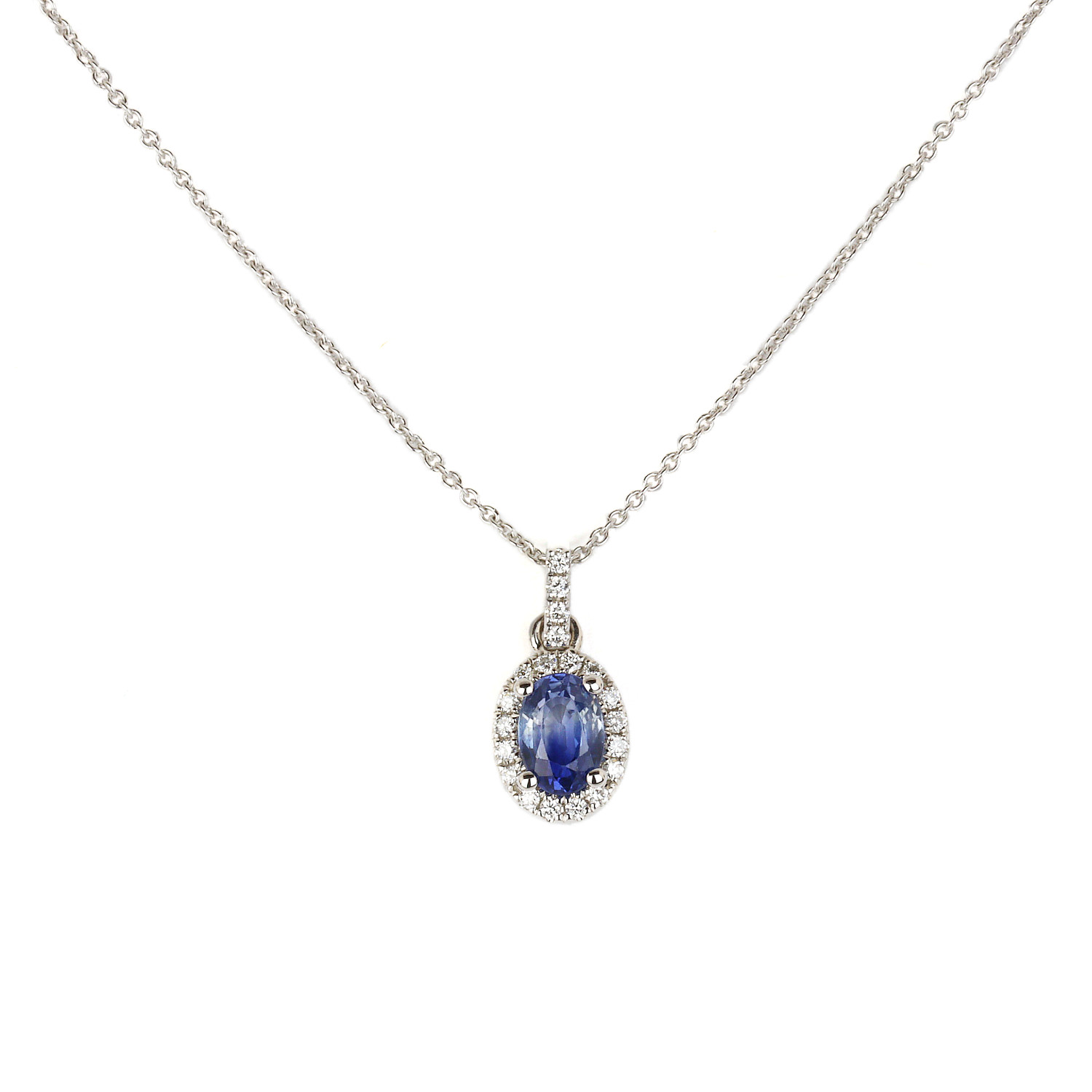 14k white gold necklace featuring a pendant containing a 6mm by 4mm tanzanite stone and diamonds which amount to approximately 0.63 carat TW. The pendant measures 14mm tall, 7mm at the widest, the chain is 20″ long, and total weight is 3.1 grams.