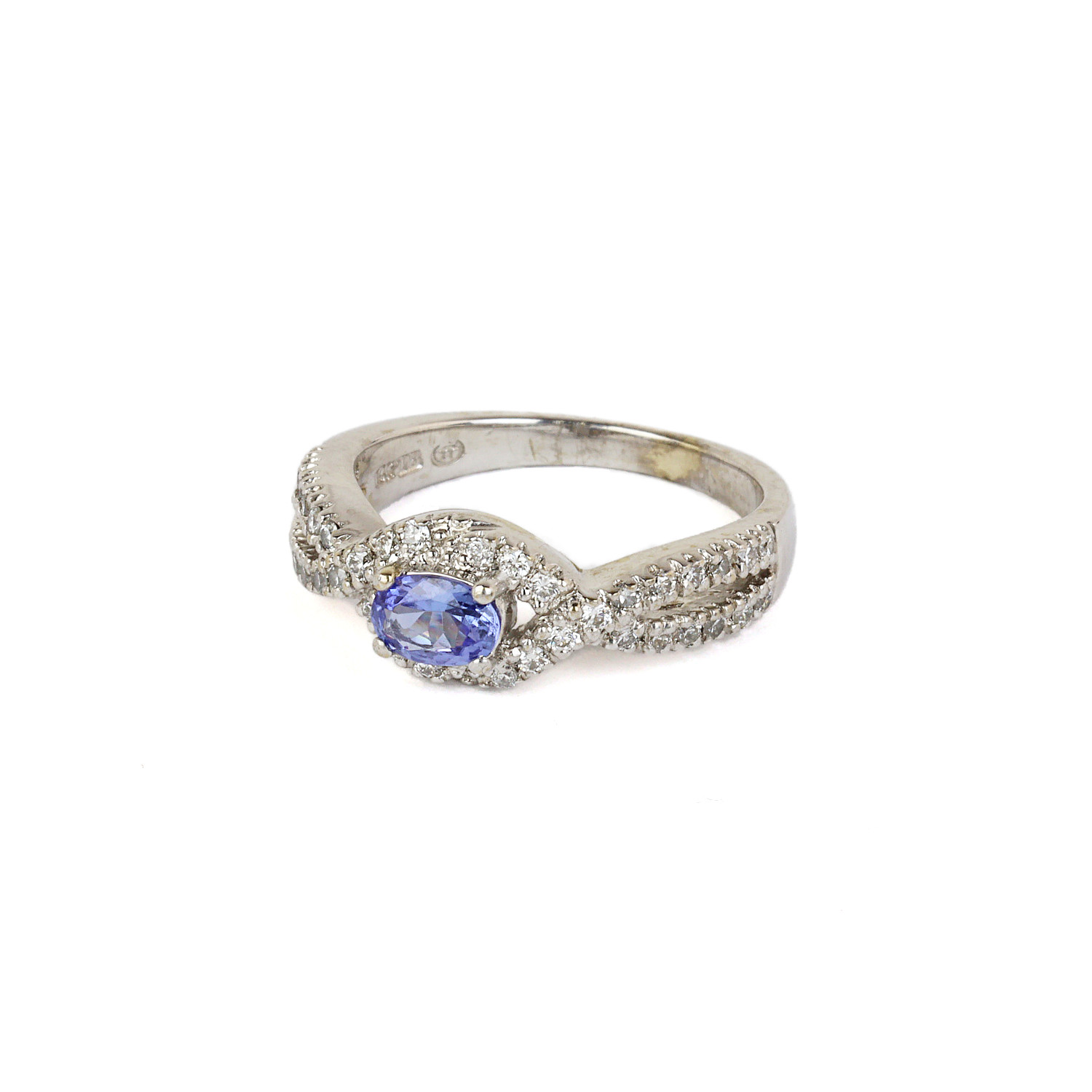 14k white gold ring with a 6mm by 4mm oval tanzanite stone and diamonds which amount to approximately 0.30 carat TW (SI1-SI2 clarity/G-H-I color). Fits a size 6.75 finger, measures 7mm wide across the top, and weighs 5.7 grams.