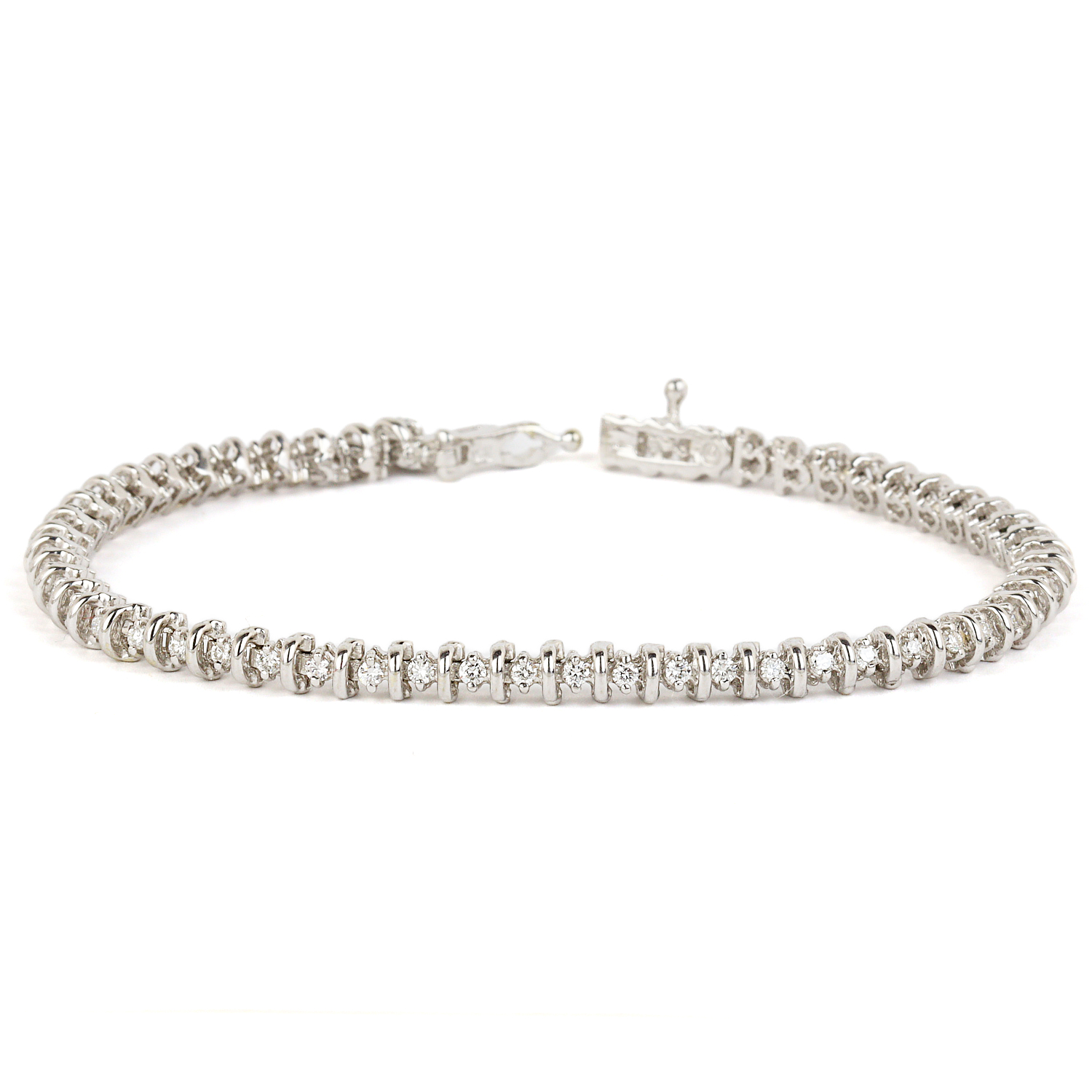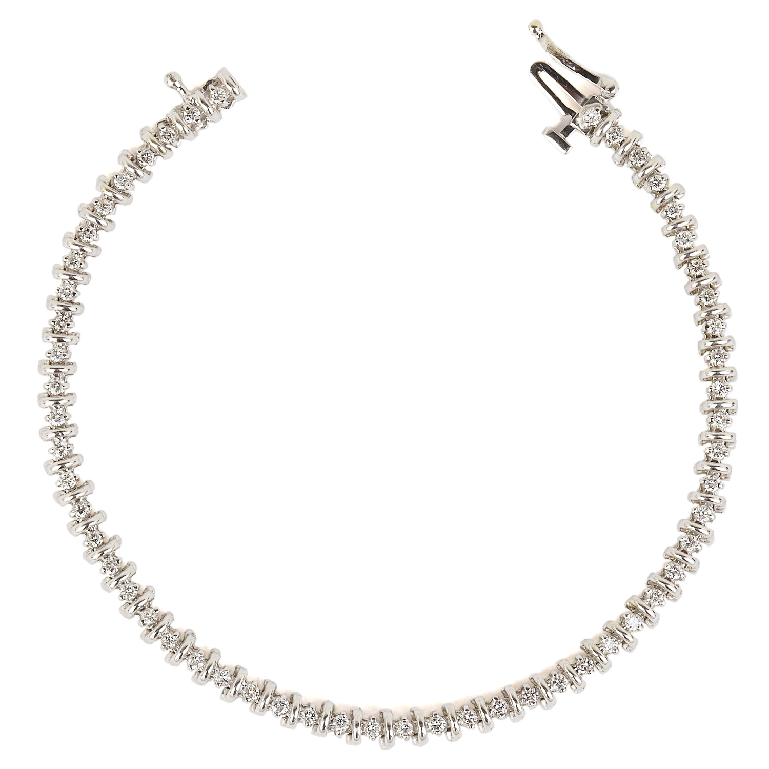 14k white gold bracelet with diamonds which amount to approximately 0.90 carat TW (SI1-I1 clarity/G-H-I color). It measures 7″ long, 4mm wide, and weighs 9.8 grams.