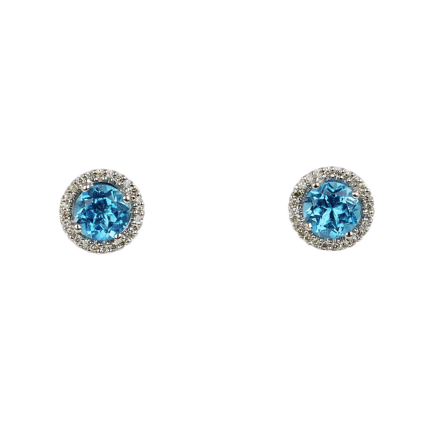 14k white gold stud earrings with blue topaz stones and diamonds which amount to approximately 0.25 carat TW (I1 clarity/G-H-I color). They measure 10mm in diameter and total weight is 2.4 grams.