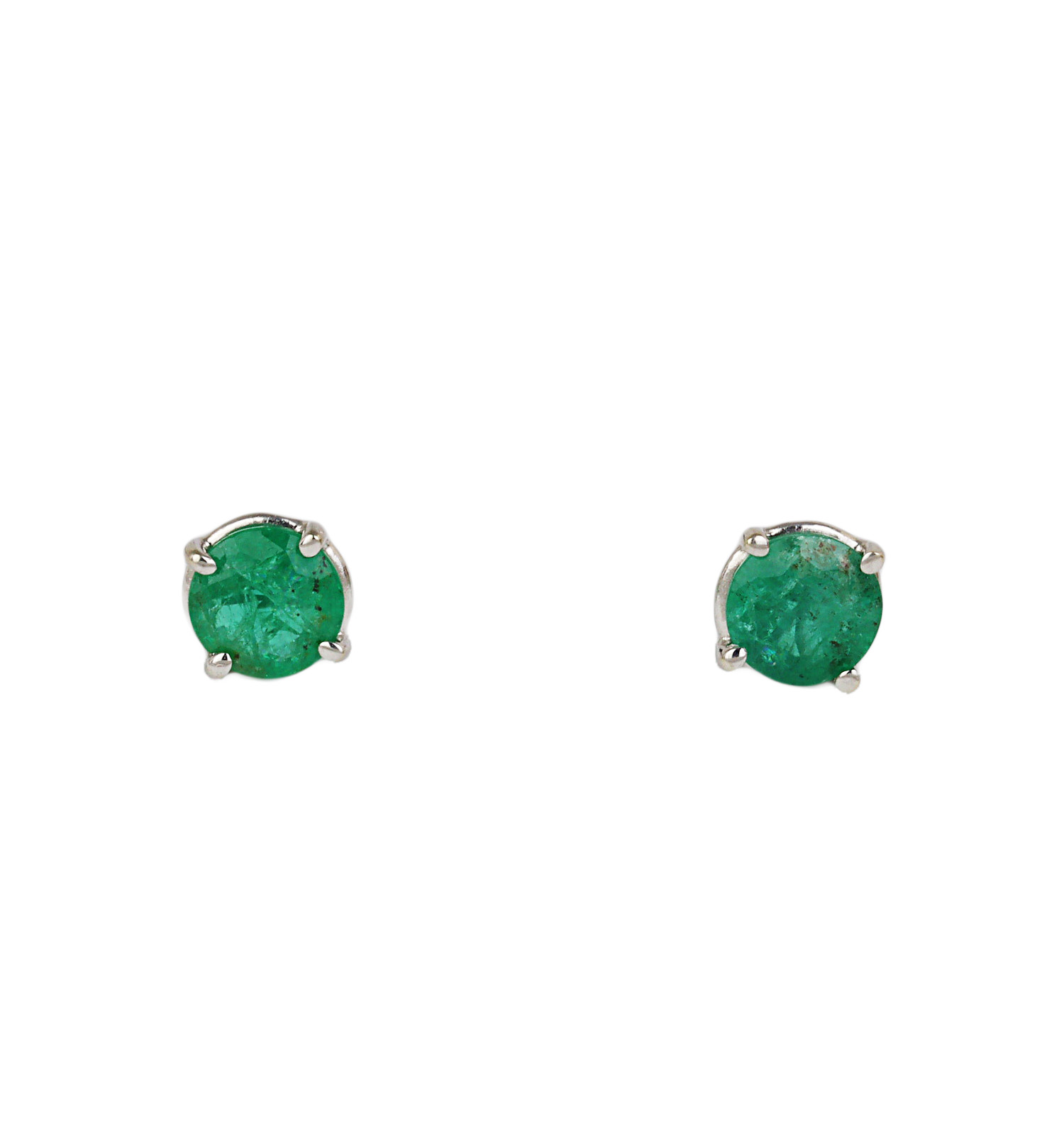 14k white gold screwback stud earrings with emerald stones. They measure 6mm in diameter and total weight is 1.6 grams.