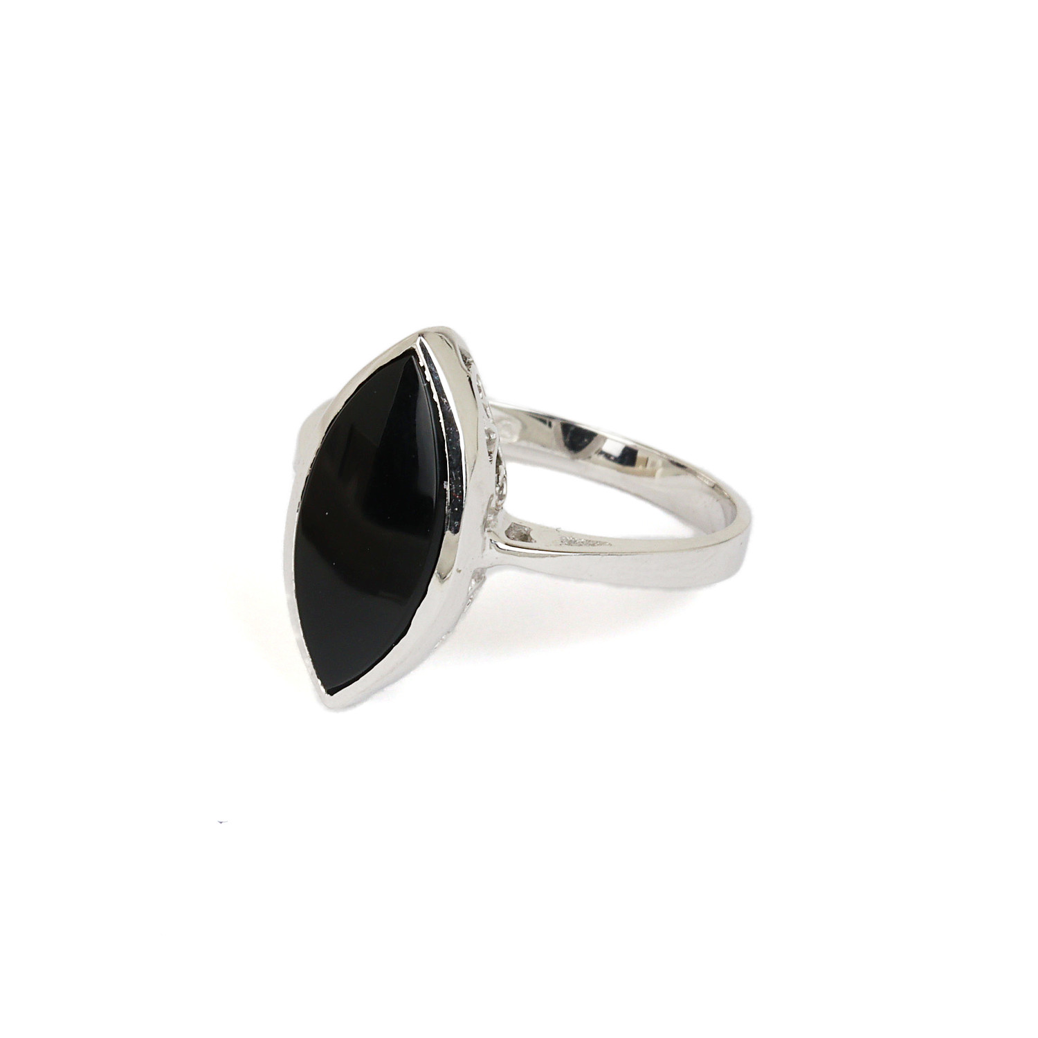 14k white gold band with a 15mm by 7mm onyx stone. It fits a size 6.25 finger, measures 17mm wide across the top, and weighs 2.9 grams.