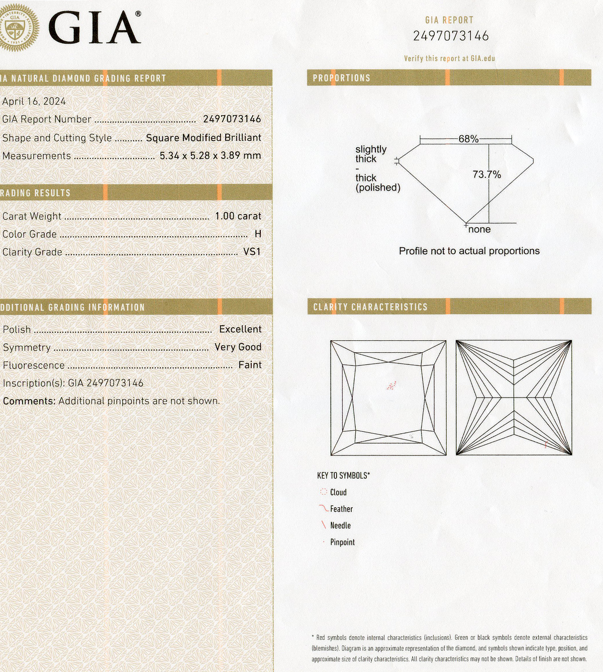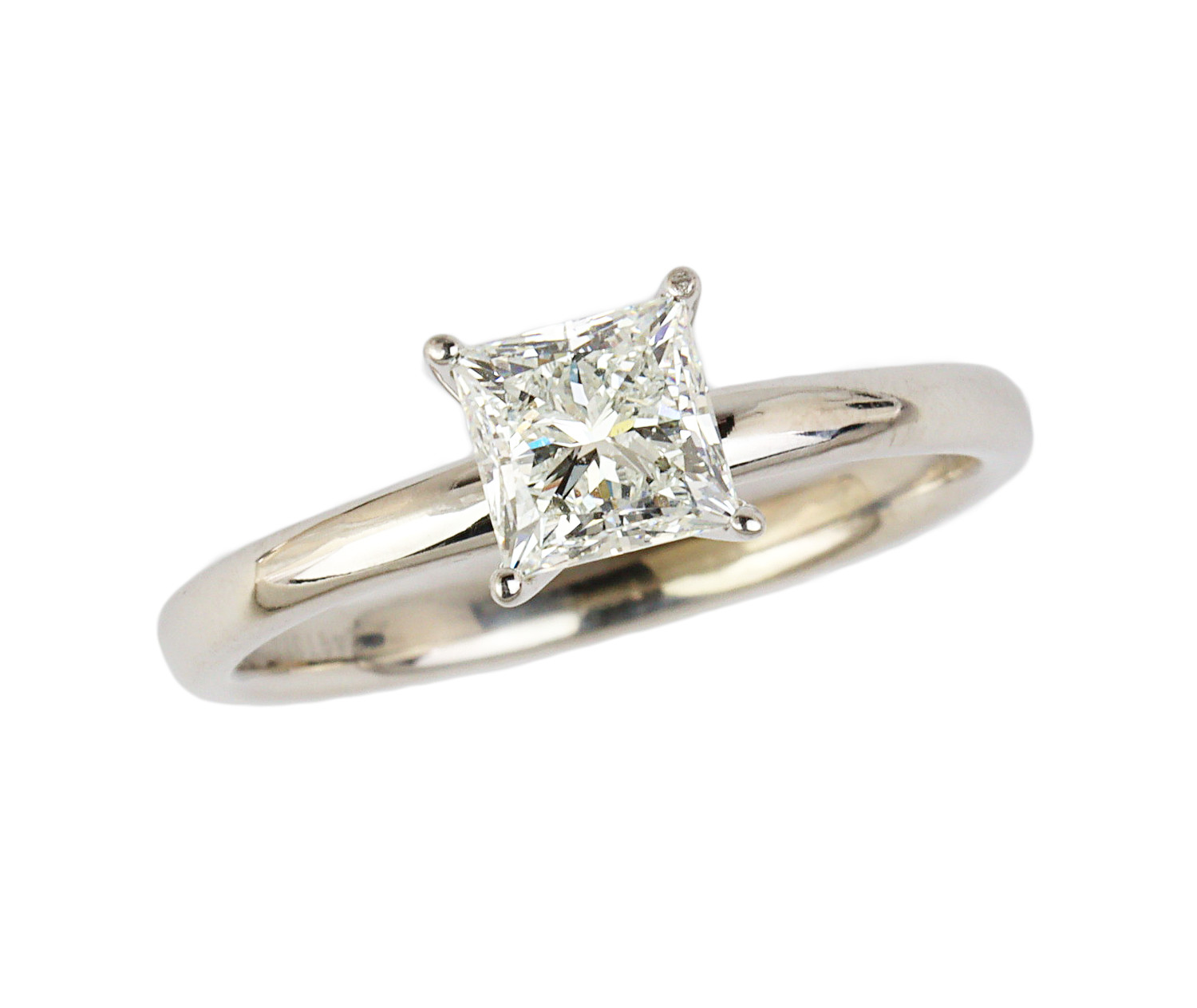 14k white gold engagement ring with a 1.00 carat square modified brilliant cut center diamond (VS1 clarity/H color), fits a size 6.75 finger, and weighs 2.9 grams. GIA cert # 2497073146 is included in the sale.