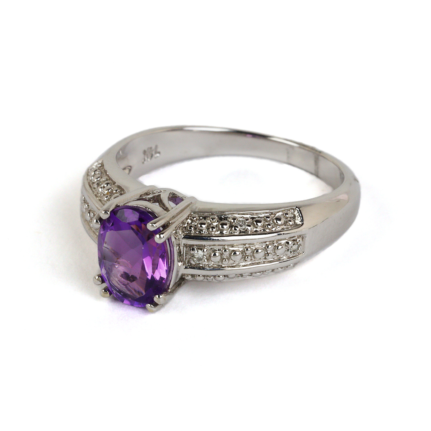 Approximately 0.02 carat TW (SI2-I1 clarity/G-H-I color). Natural amethyst stone. Size 7. 4.3g.