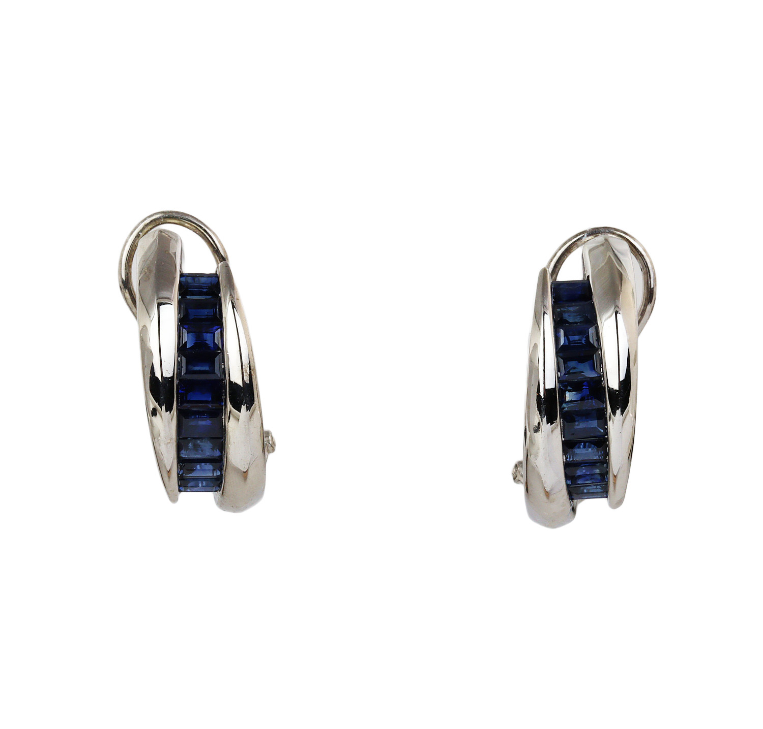 14k white gold half hood earrings with sapphire stones. They measure 18mm tall, 13mm wide, and total weight is 6.0 grams.