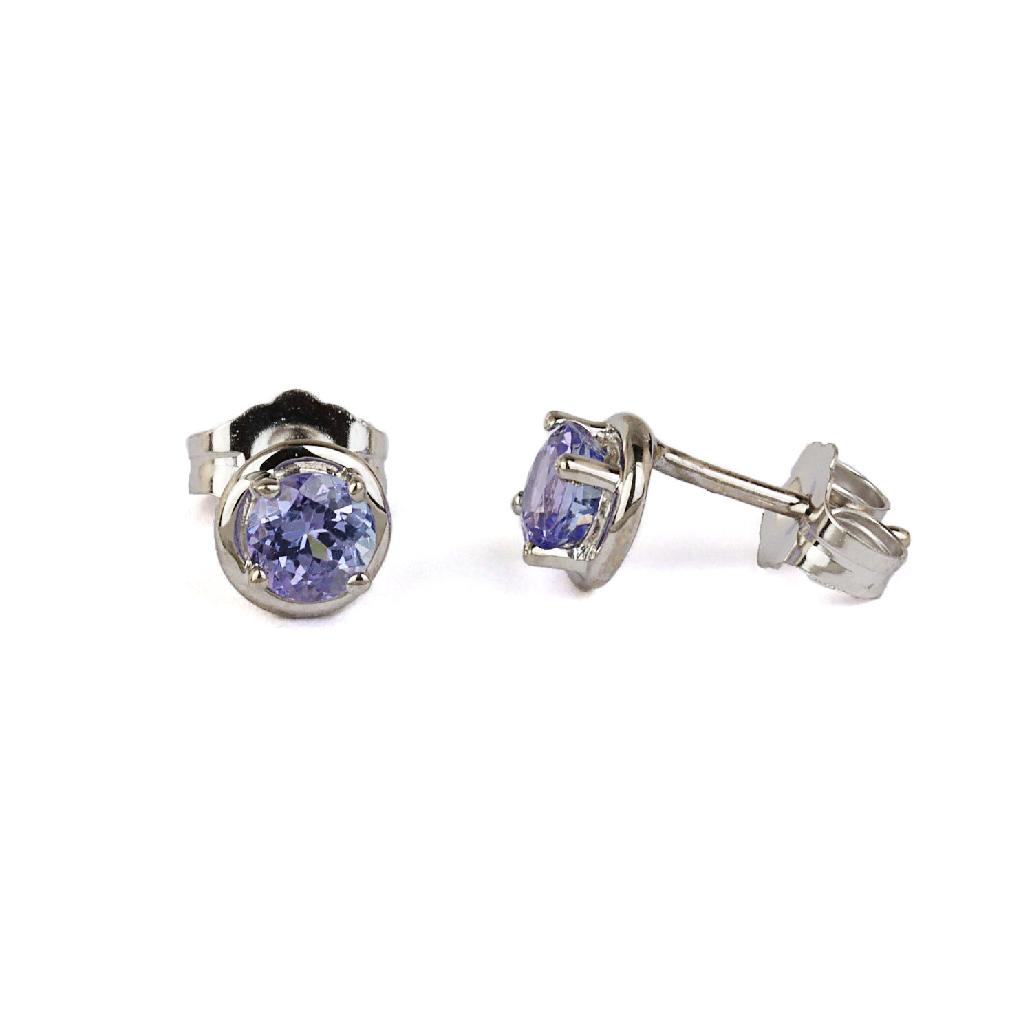 14k white gold stud earrings with 4.5mm in diameter tanzanite stones. They measure 6mm in diameter and total weight is 1.0 gram.