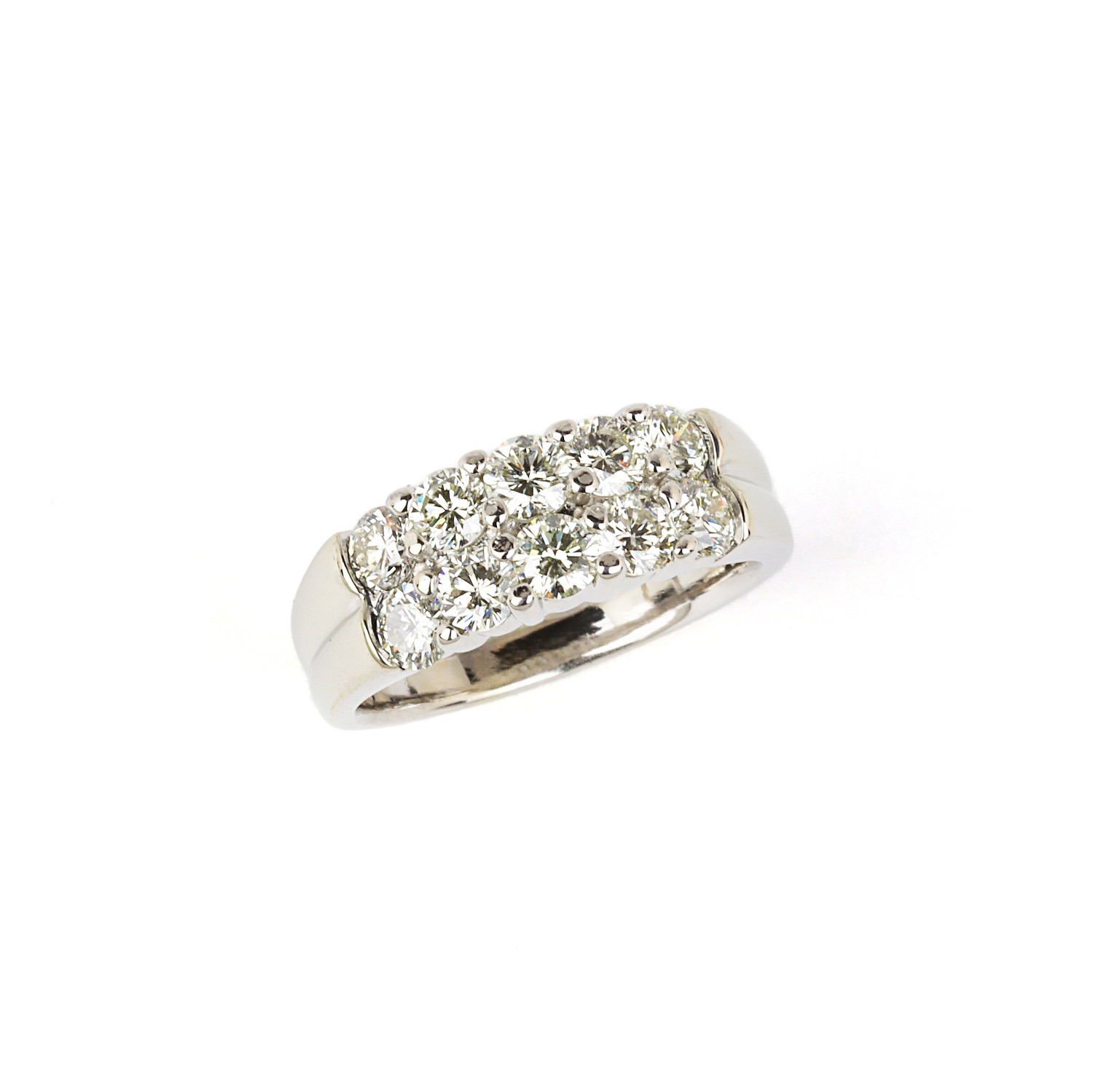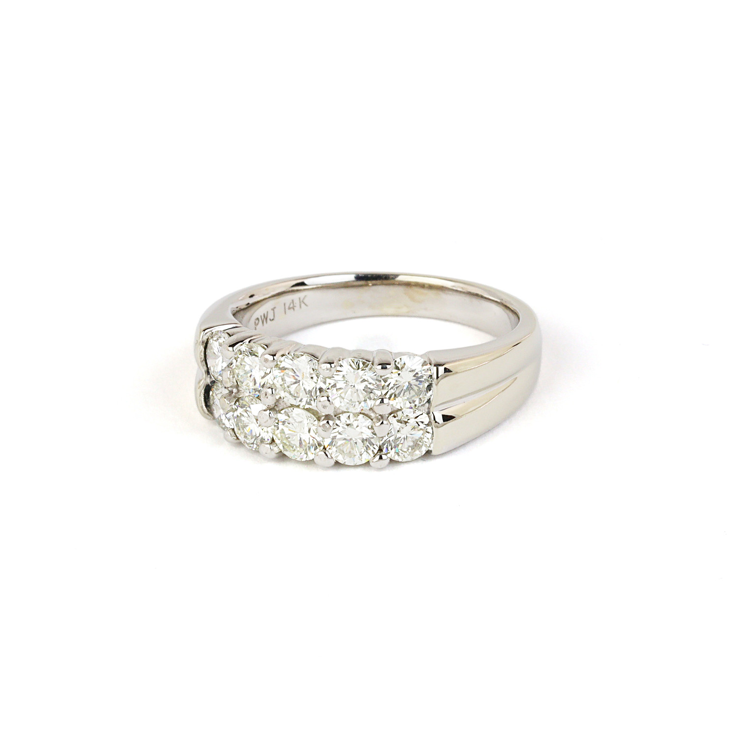 14k white gold ring with two rows of diamonds which amount to approximately 1.50 carat TW (I1 clarity/G-H-I color). Fits a size 7.75 finger, measures 7.5mm wide across the top, and weighs 8.2 grams.