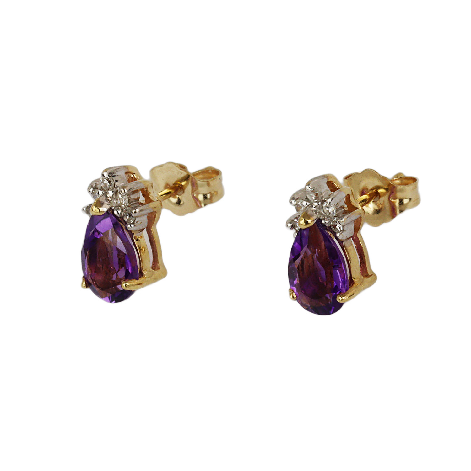 14k yellow gold stud earrings with teardrop amethyst stones and diamonds which amount to 0.08 TW (VS2-SI2 clarity/G-H-I color). They measure 10mm tall, 5mm wide, and total weight is 1.9 grams.