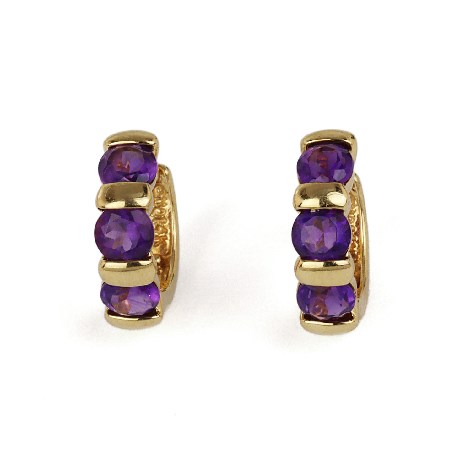 14k yellow gold hoop earrings with 5mm amethyst stones. They measure 13mm tall, 5mm wide, and total weight is 2.7 grams.