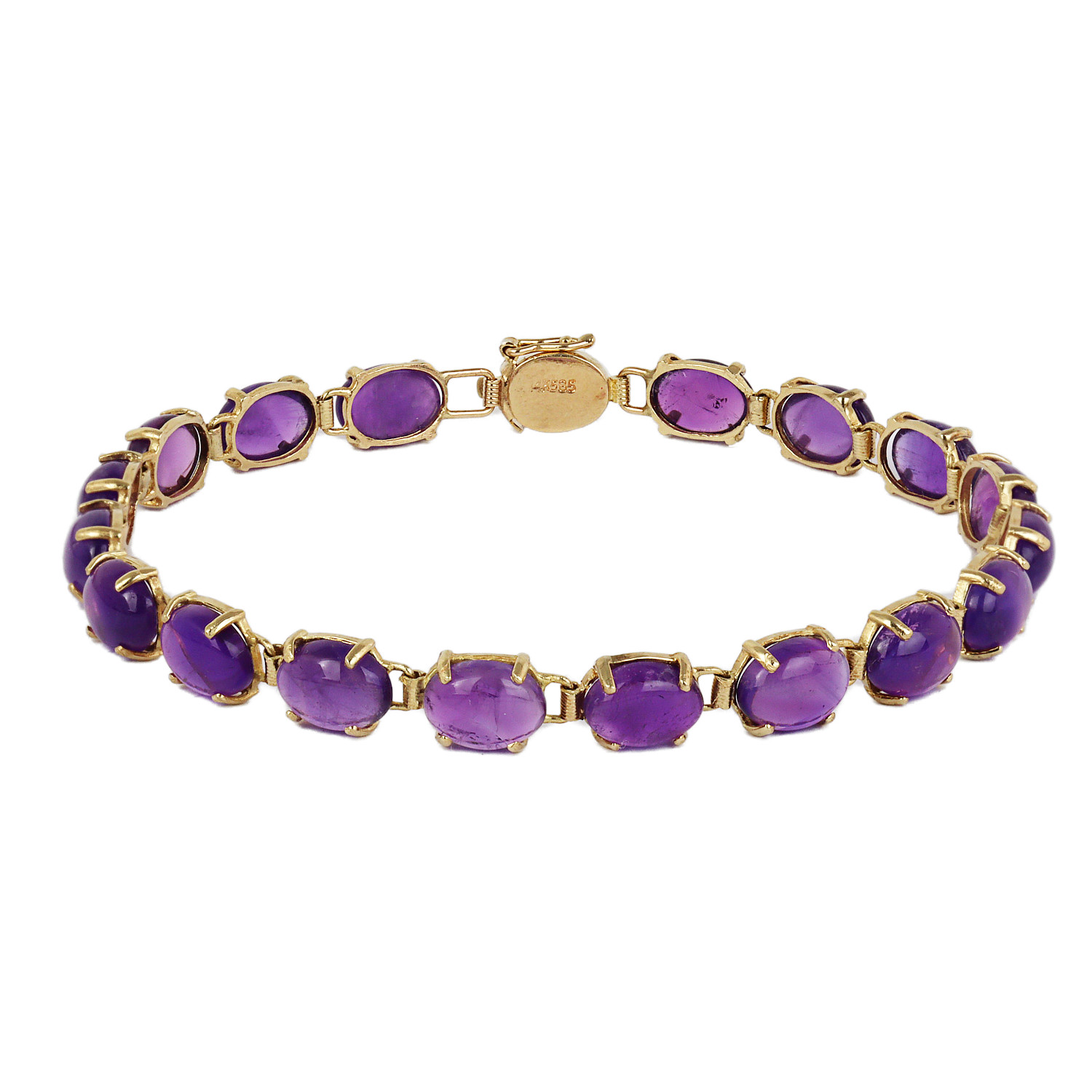 14k yellow gold bracelet with 7mm by 5mm cabochon oval amethyst stones. It measures 7 1/2″ long, 6mm wide, and weighs 7.9 grams.