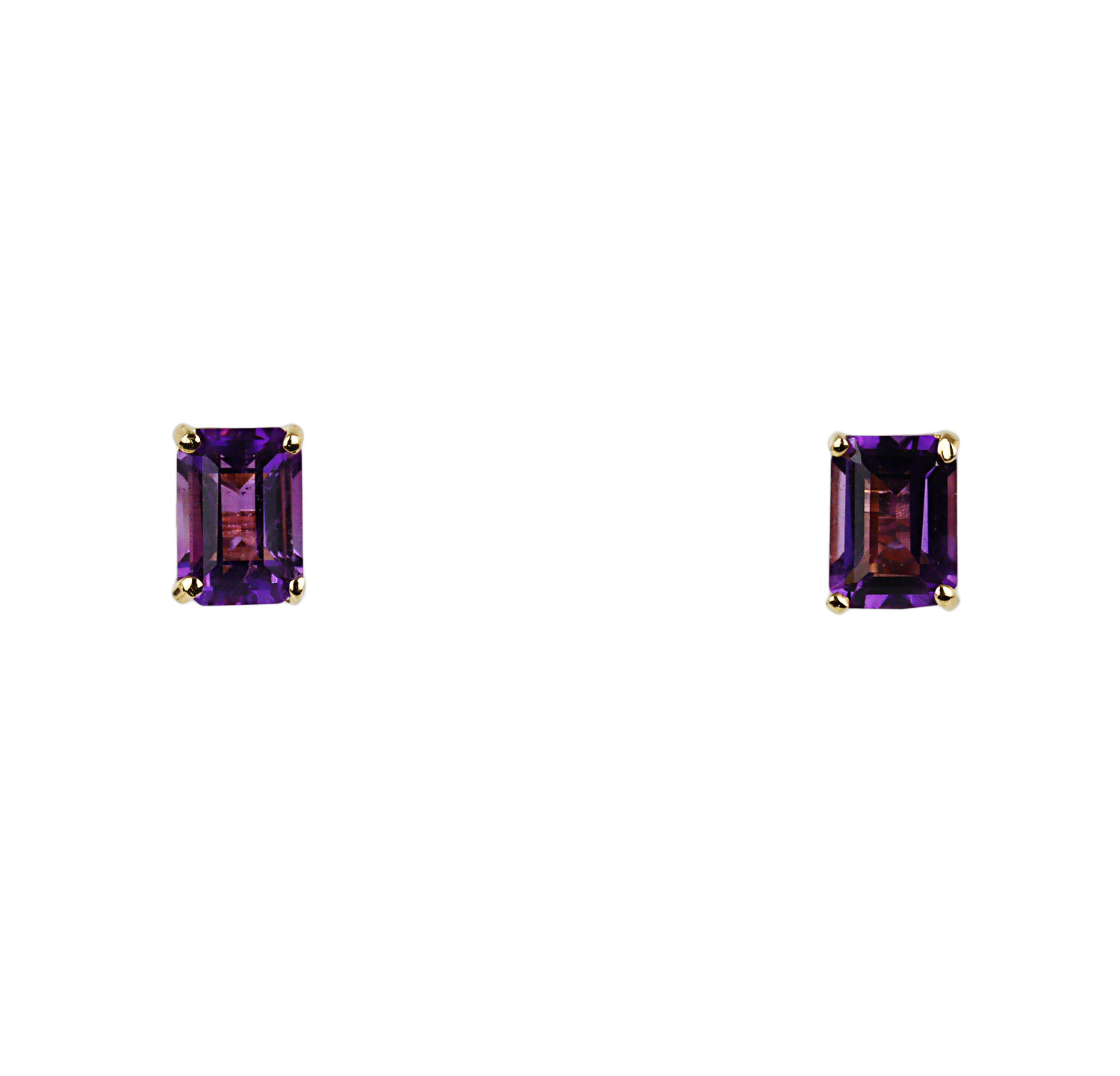 14k yellow gold stud earrings with amethyst stones. They measure 7mm tall, 5mm wide, and total weight is 1.3 grams.
