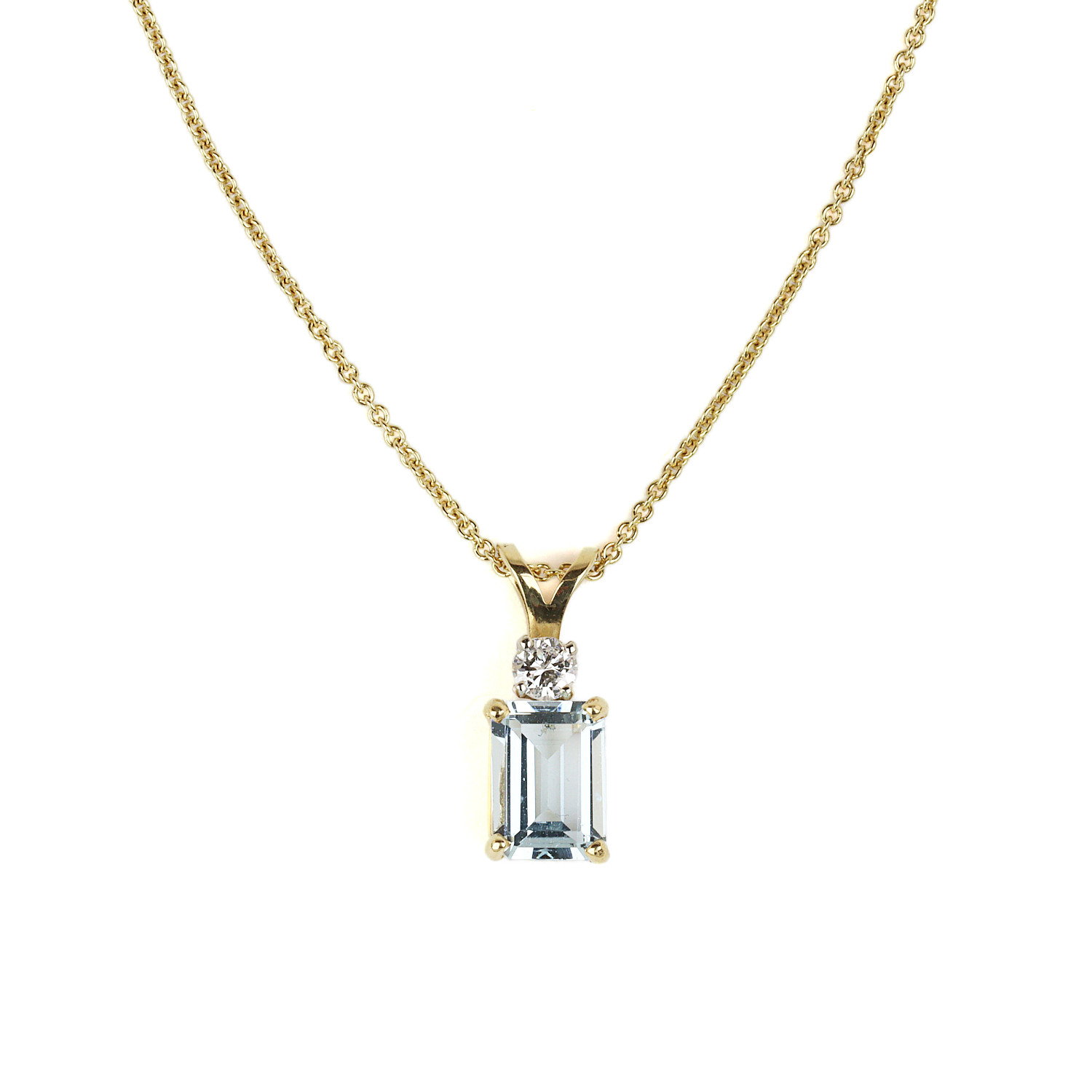 14k yellow gold necklace featuring a pendant containing a 6mm by 8mm aquamarine stone and diamond which amounts to approximately 0.08 carat. The pendant measures 15mm tall, 6mm at the widest, the chain is 16″ long, and total weight is 2.1 grams.