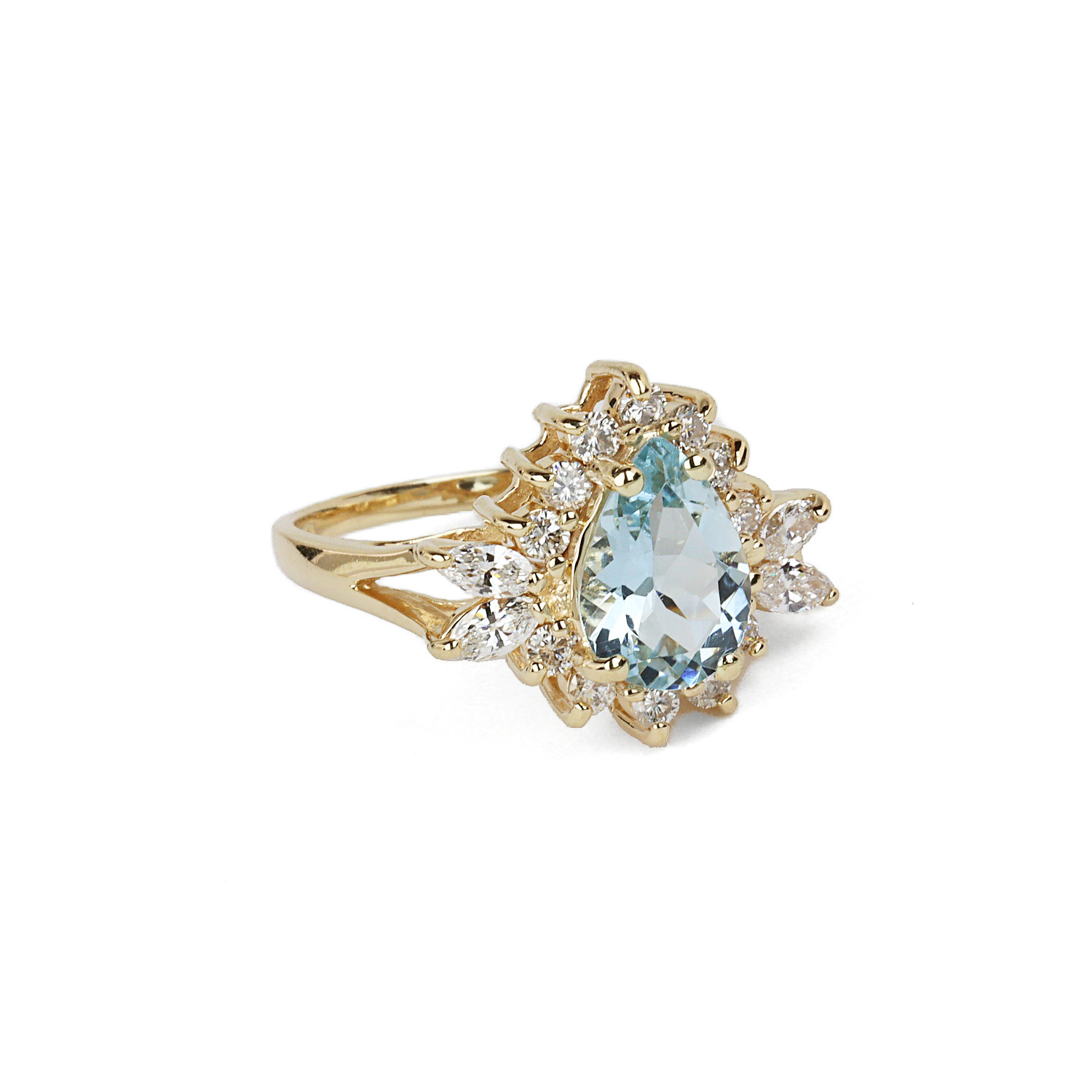 14k yellow gold ring with a 7mm by 10mm teardrop aquamarine stone and diamond accents which amount to approximately 0.65 carat TW (SI1-SI2 clarity/G-H-I color). Fits a size 7 finger, measures 15mm wide across the top, and weighs 4.5 grams.