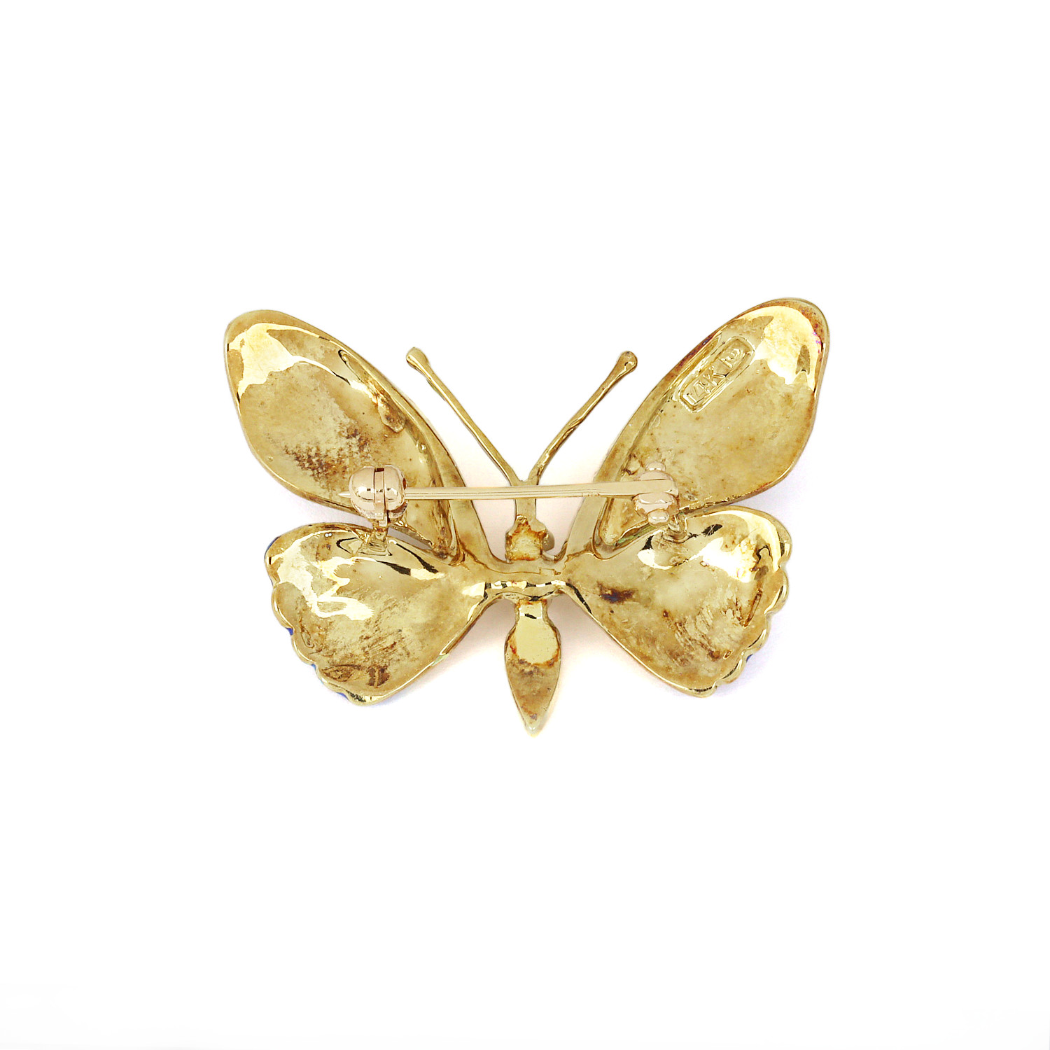 14k yellow gold brooch featuring an enameled butterfly. It measures 25mm tall, 35mm at the widest, and weighs 6.6 grams.