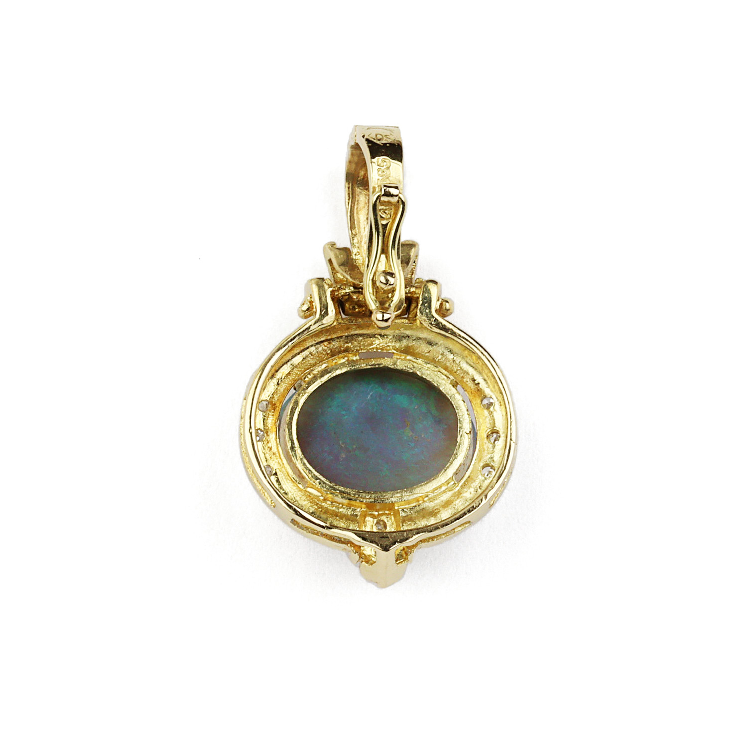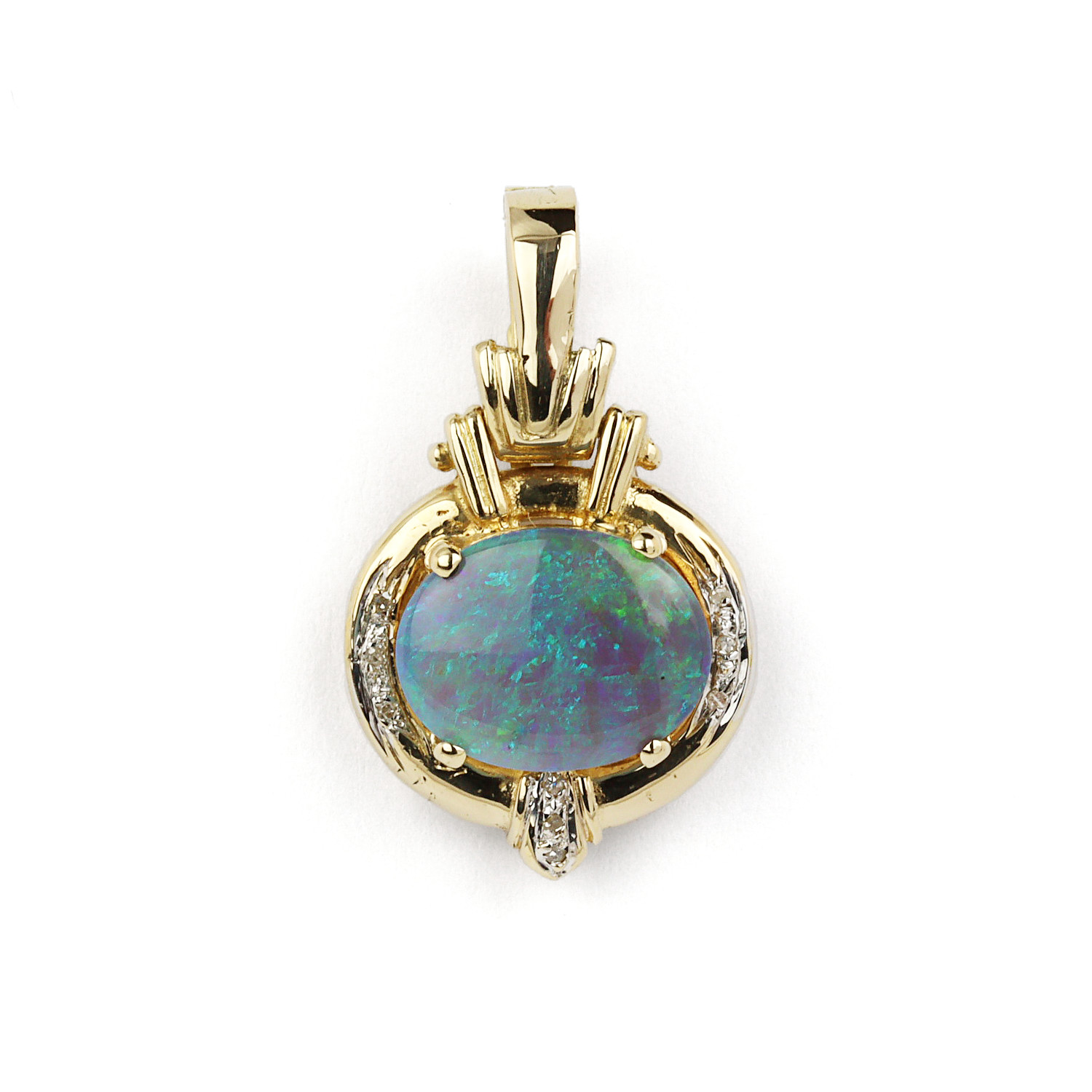 14k yellow gold pendant with a 10mm by 13mm black opal and diamonds which amount to approximately 0.03 carat TW (SI2-I1 clarity/I-J-K color). It measures 28mm tall, 17mm at the widest, will fit a 5mm chain, and weighs 4.0 grams.