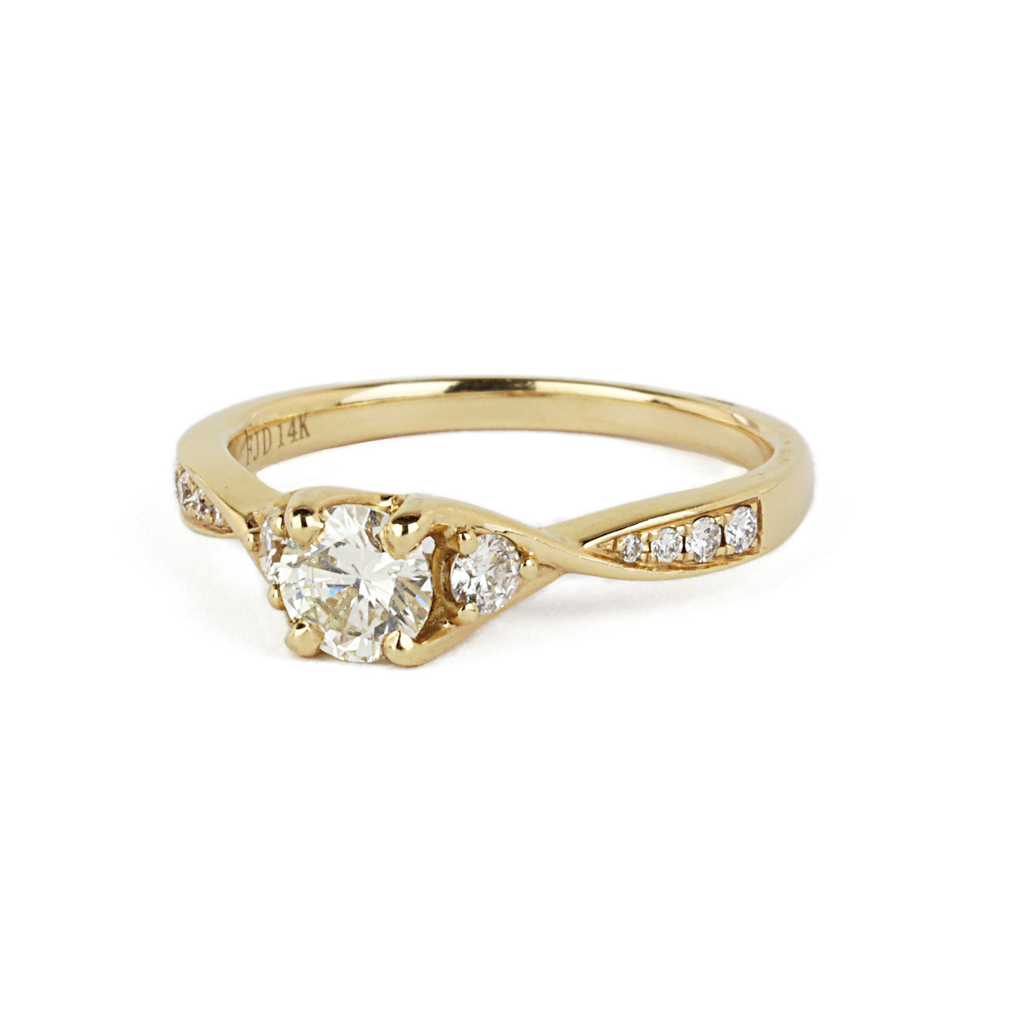14k yellow gold ring with a 0.48 carat round brilliant cut center diamond (VS2 clarity/H-I color) with diamond accents which amount to approximately 0.21 carat TW (VS2-SI1 clarity/F-G color). Measures 5mm wide across the top, fits a size 7 finger, and weighs 3.0 grams. EGL cert # 916205001D is included in the sale.