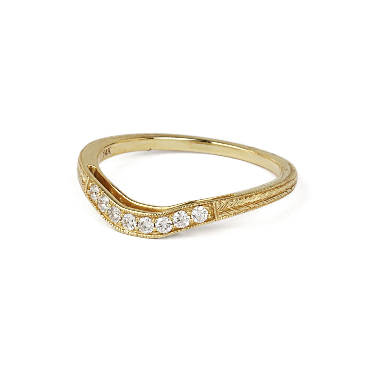 14k yellow gold ring with diamonds which amount to approximately 0.12 carat TW (VS1-VS2 clarity/G-H-I color). Fits a size 6.5 finger, measures 5mm wide across the top, and weighs 1.8 grams.