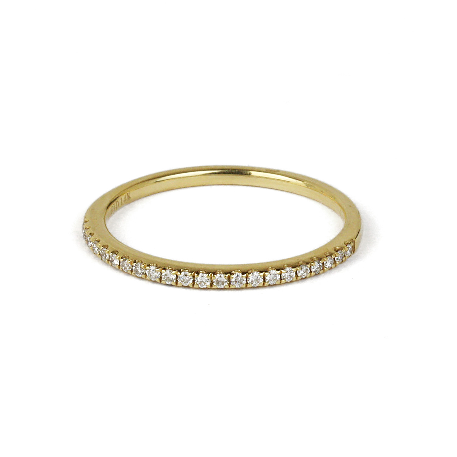 14k yellow gold ring with diamonds which amount to approximately 0.10 carat TW (SI1-I1 clarity/G-H-I color). Fits a size 6 finger, measures 2mm wide, and weighs 1.2 grams.