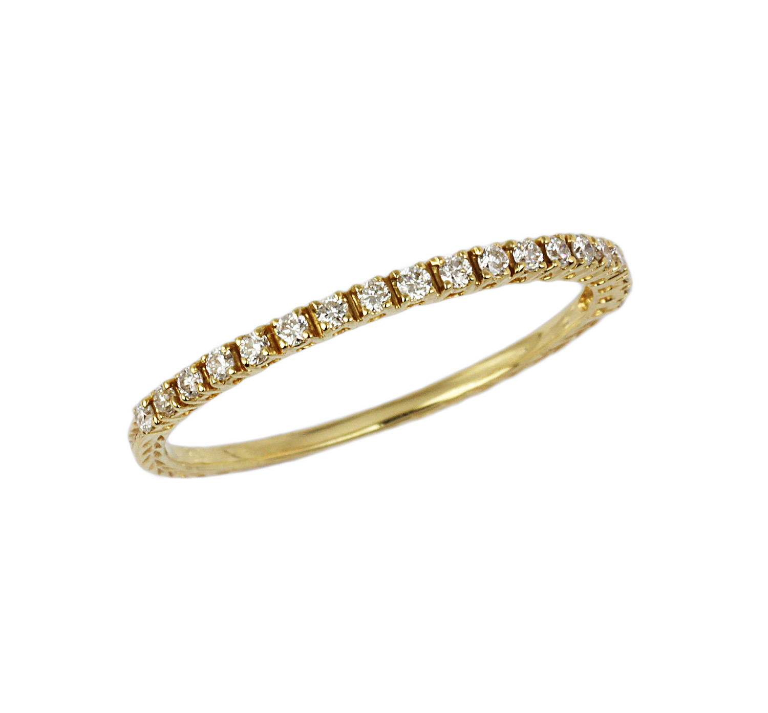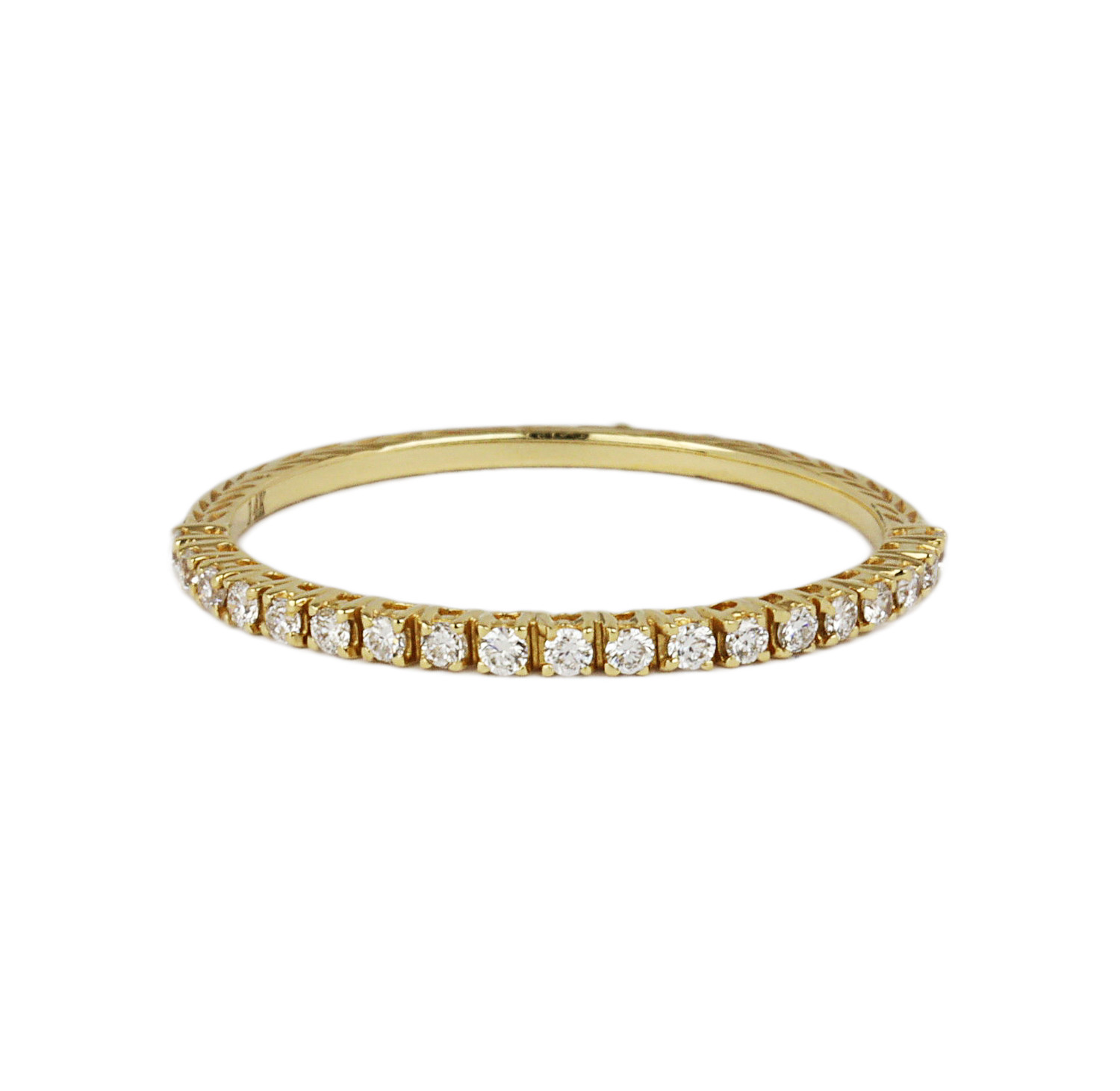 14k yellow gold ring with diamonds which amount to approximately 0.14 carat TW (SI1-I1 clarity/H-I-J color). Fits a size 6.75 finger, measures 1.5mm wide, and weighs 0.8 gram.