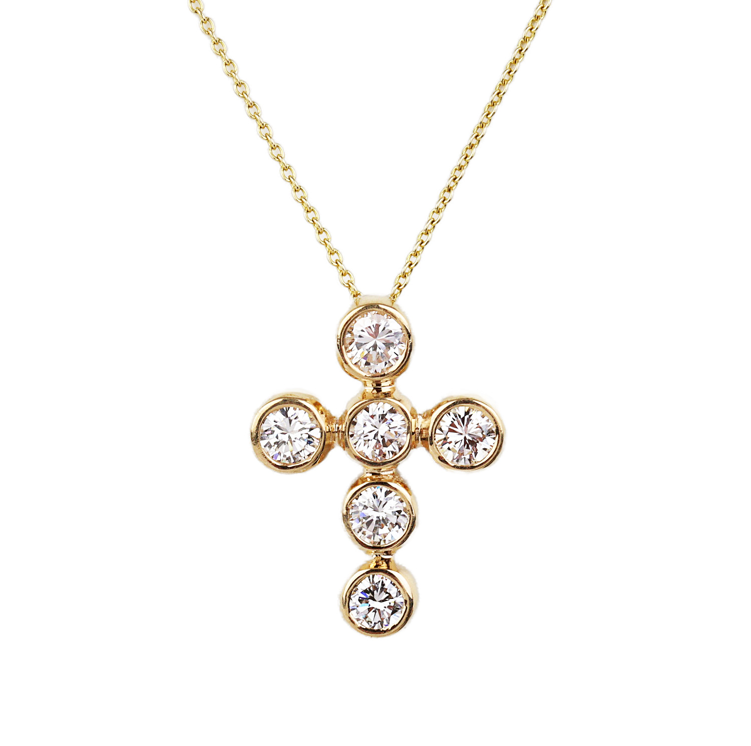 14k yellow gold necklace featuring a cross pendant containing diamonds which amount to 1.44 carat TW (SI1-SI2 clarity/G-H-I color). The pendant measures 19mm tall by 14mm wide, the chain is 18″ long, and total weight is 3.5 grams.