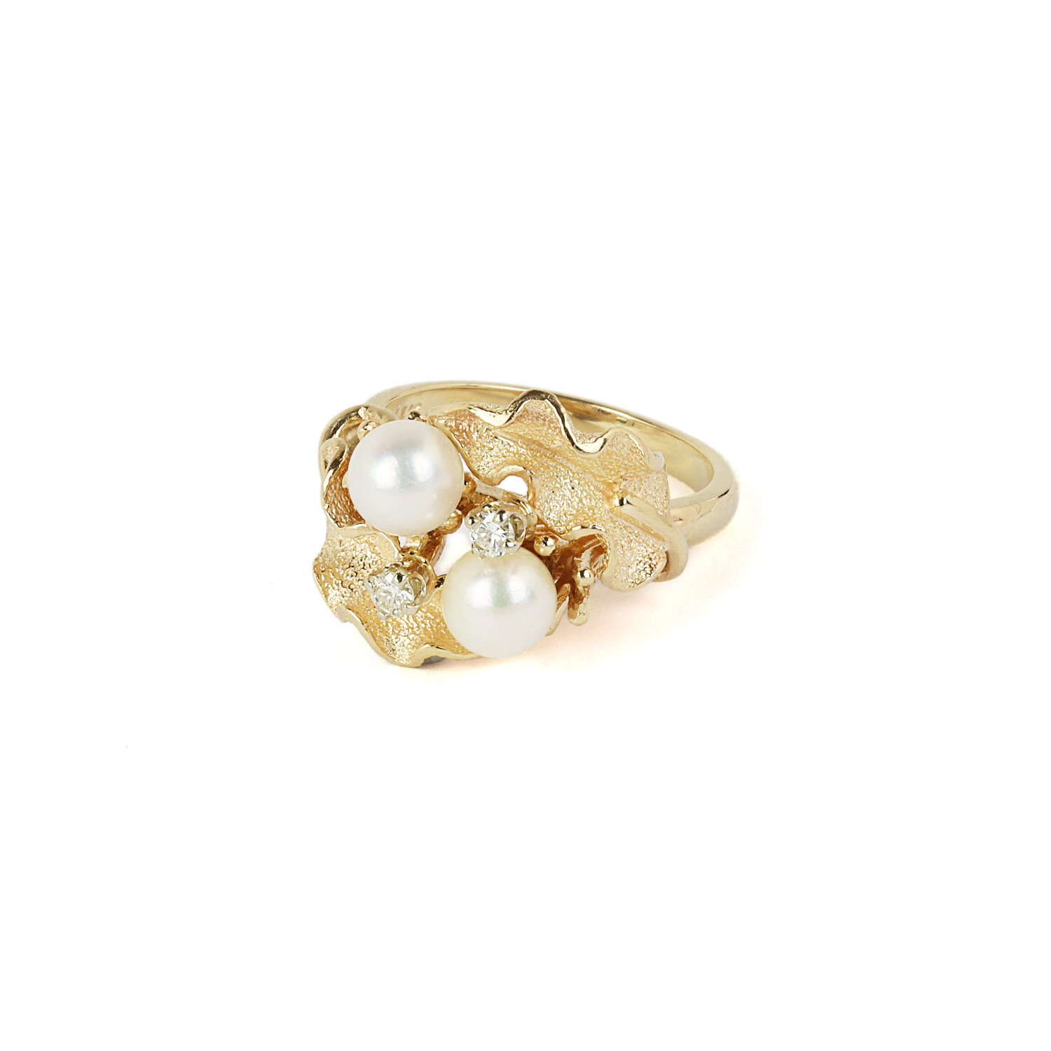14k yellow gold ring with 6mm diameter pearls and diamonds which amount to approximately 0.04 carat TW (VS2 clarity/H-I color). Fits a size 5.25 finger, measures 15mm wide across the top, and weighs 5.9 grams.