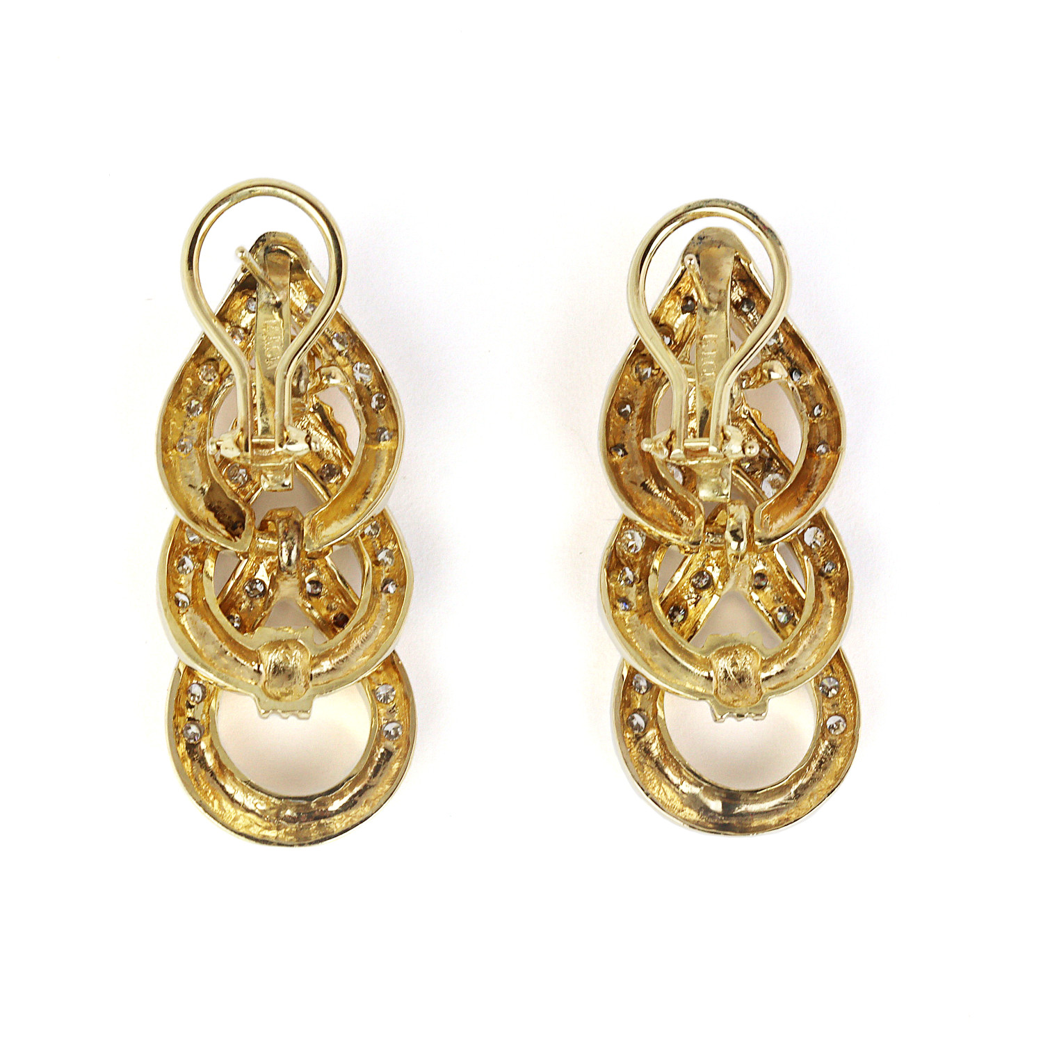 14k yellow gold dangle stud earrings featuring omega closures and 1.25 carat TW of round diamonds (I1 clarity, G-H-I clarity). They measure 39mm tall by 16mm wide. 18.9g