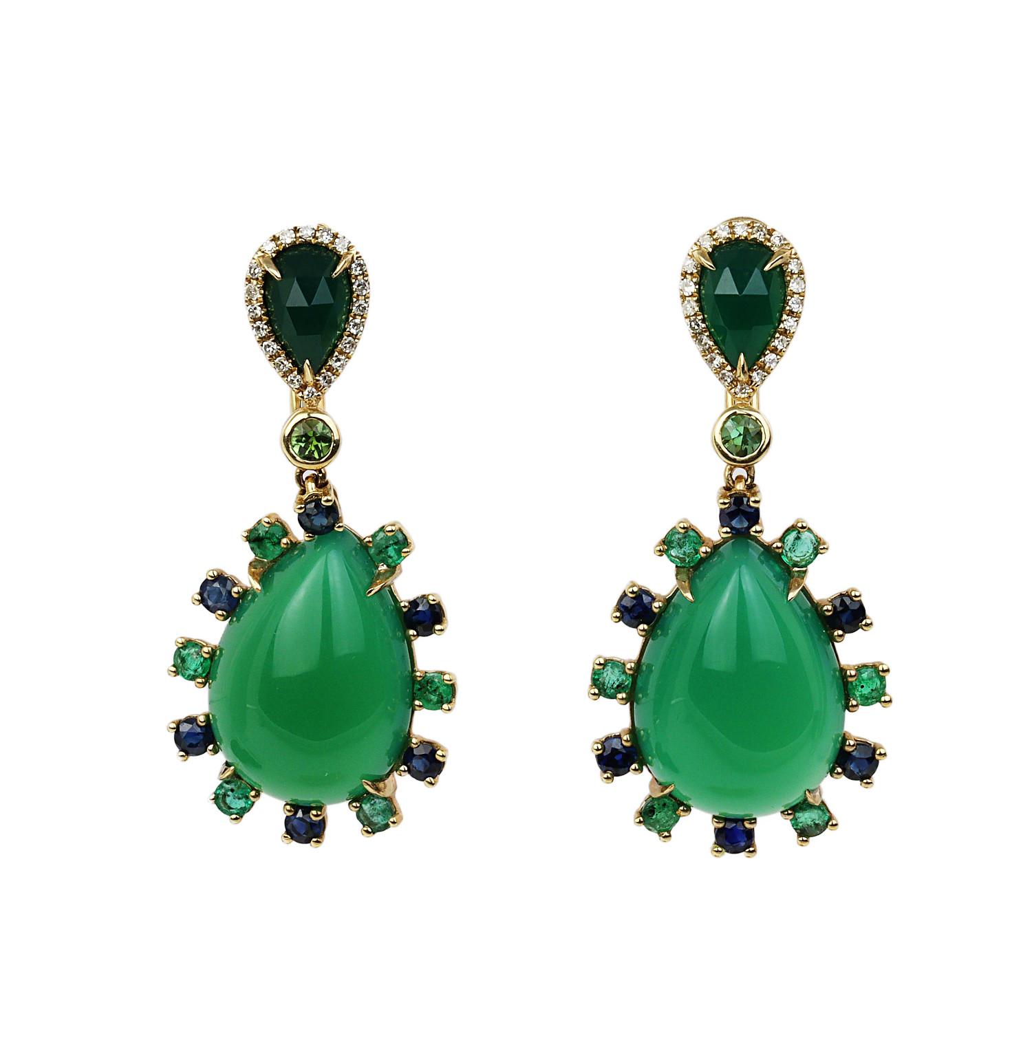 14k yellow gold dangle earrings with green agates, sapphires, emerald, and diamonds which amount to approximately 0.06 carat TW (SI1-I1 clarity/G-H-I color). They measure 38mm tall, 18mm at the widest, and total weight is 10.3 grams.