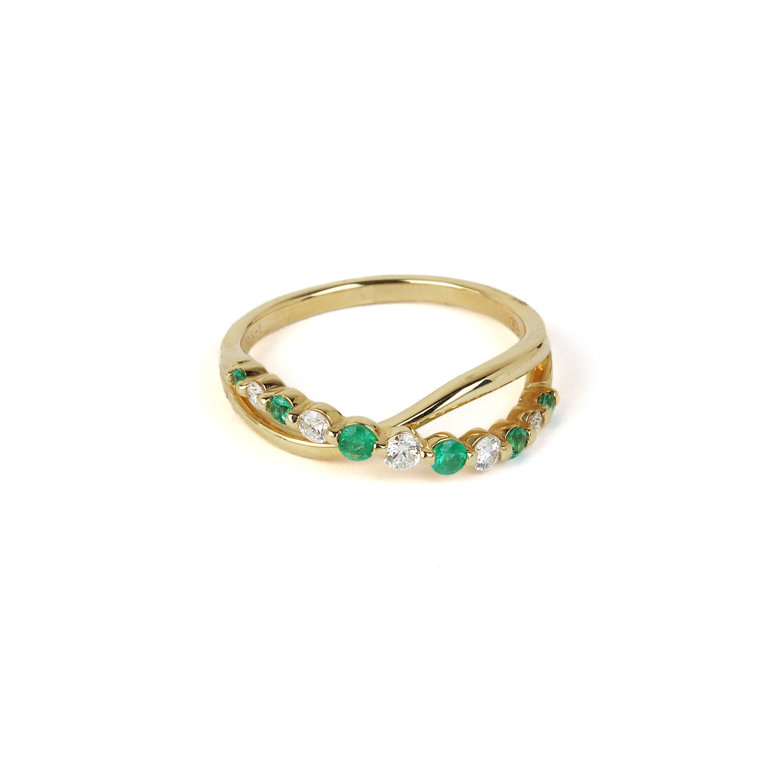 14k yellow gold ring with emerald stones and diamonds which amount to approximately 0.19 carat TW (SI1-I1 clarity/G-H-I color). Fits a size 7 finger, measures 5mm wide across the top, and weighs 2.6 grams.