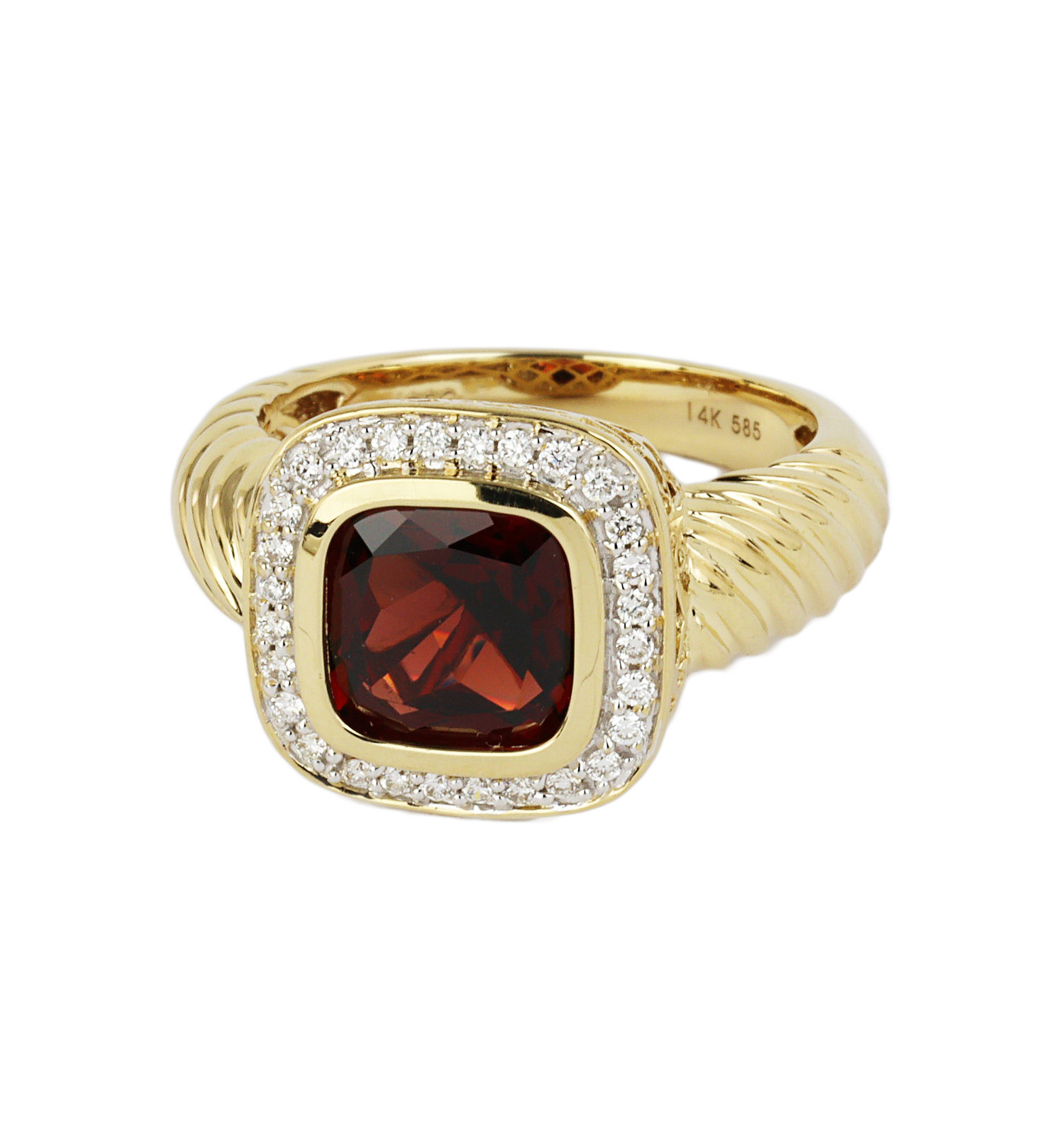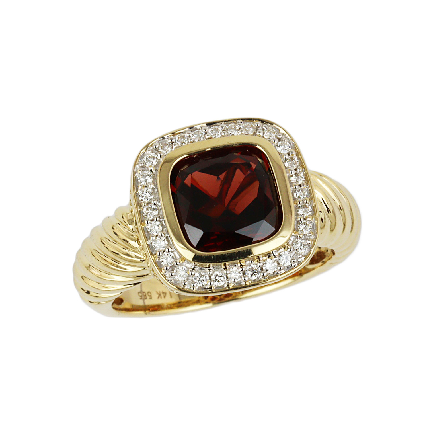 14k yellow gold ring with a 8mm in diameter garnet stone and diamond accents which amount to approximately 0.17 carat TW (VS1-VS2 clarity/G-H-I color). Fits a size 7 finger, measures 14mm wide across the top, and weighs 6.2 grams.