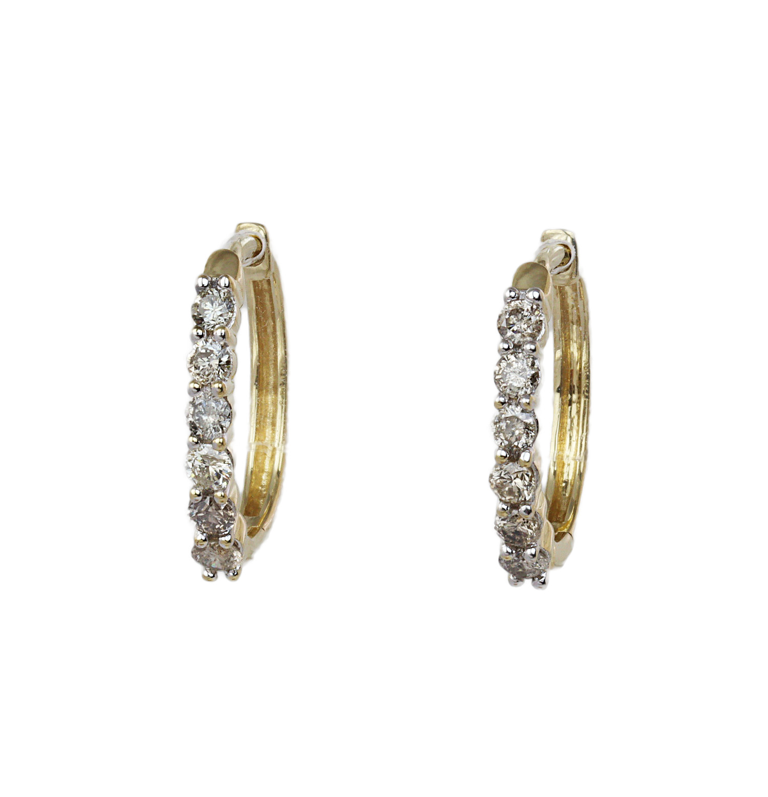 14k yellow gold hoop earrings with diamonds which amount to approximately 0.25 carat TW (I1 clarity/K-L-M color). They measure 16mm in diameter and total weight is 2.9 grams.