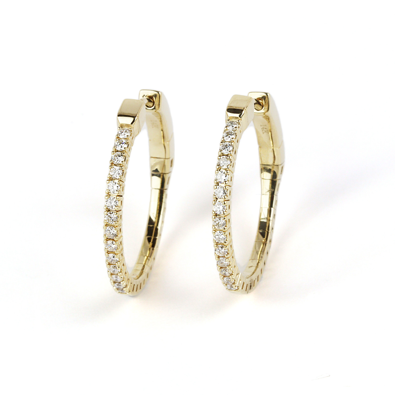 14k yellow gold hinged hoop earrings featuring 0.40 carat TW of round diamonds. They measure 24mm in diameter by 2mm wide. 5.2g