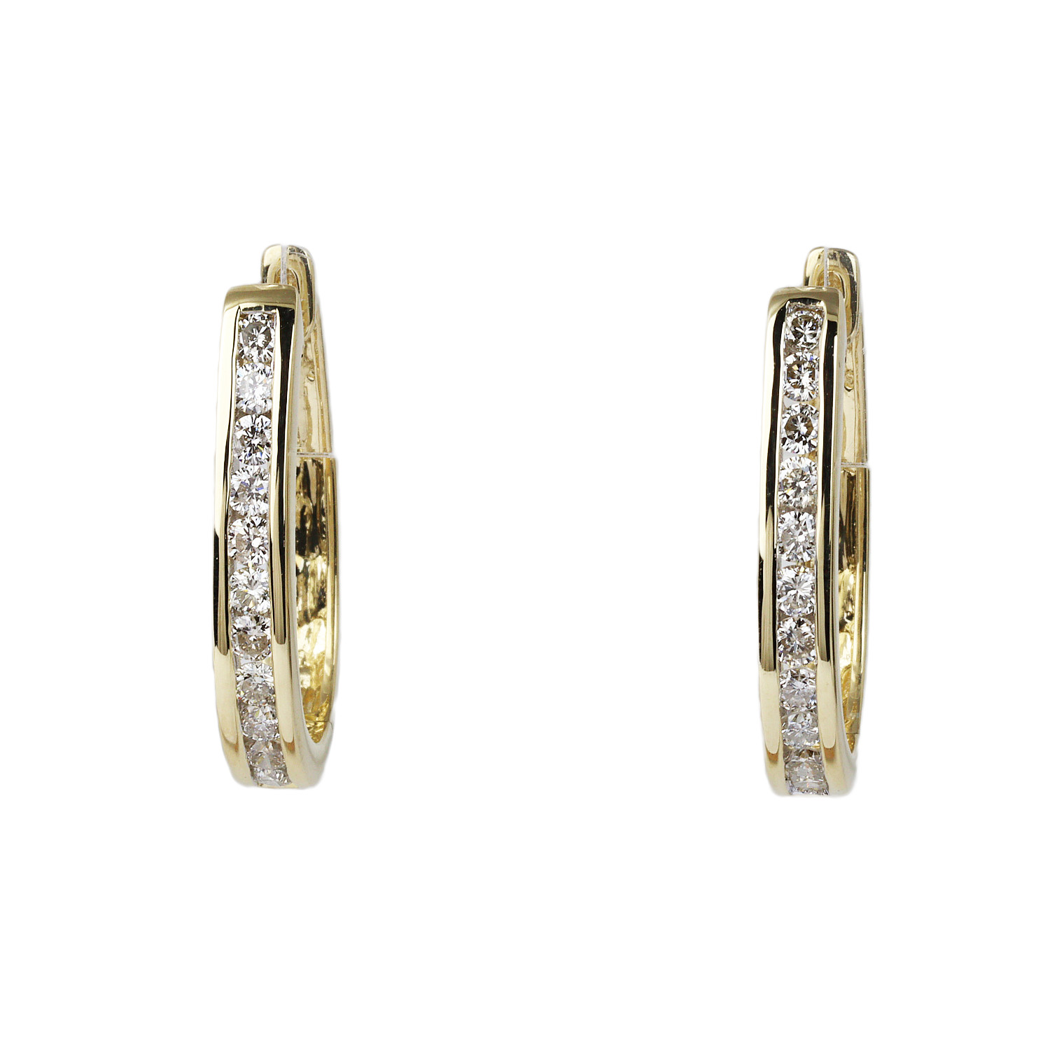 14k yellow gold hinged hoop earrings with diamonds which amount to approximately 0.80 carat TW (I1 clarity/H-I-J color). They measure 24mm tall and total weight is 5.8 grams.