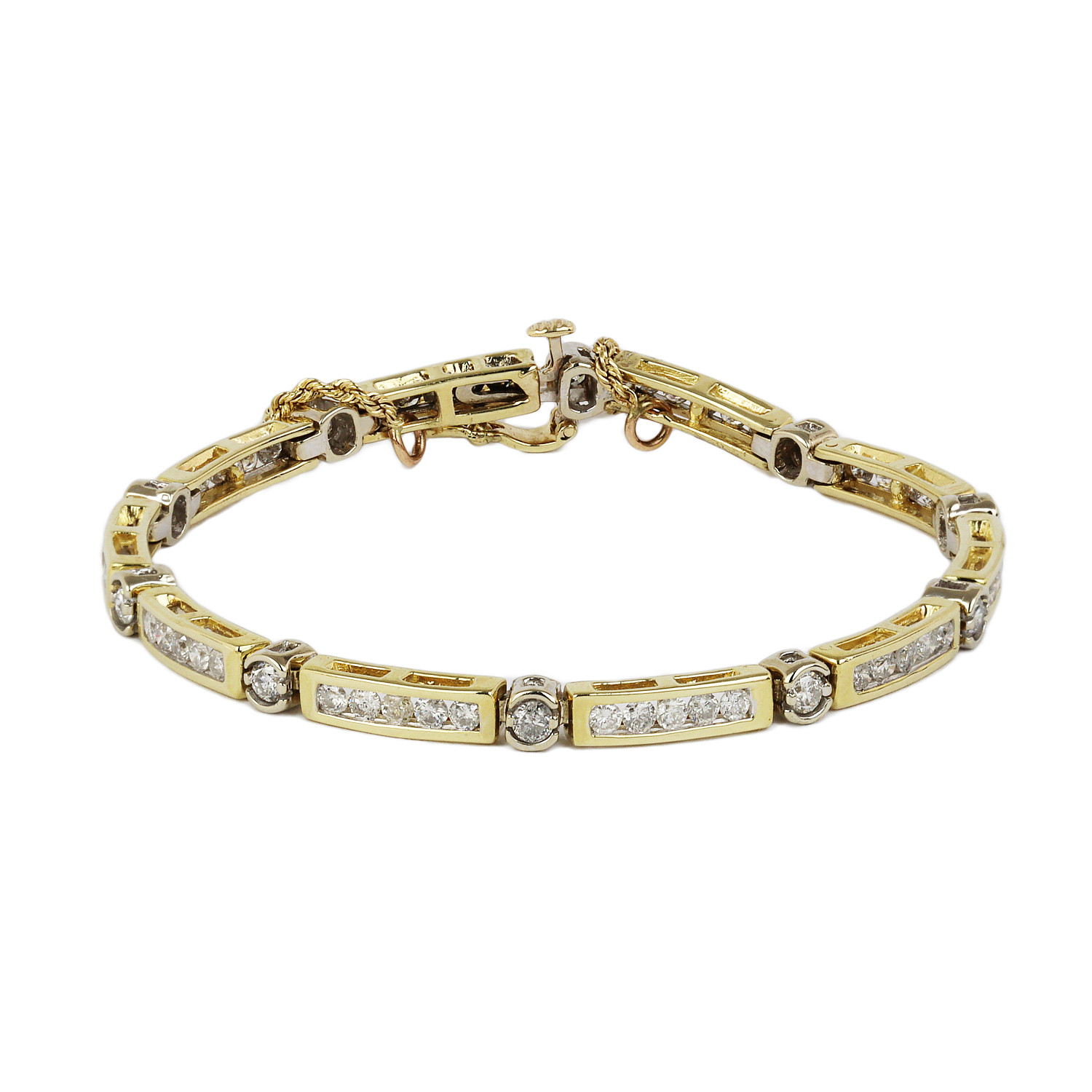 14k yellow gold bracelet with diamonds which amount to approximately 2.00 carat TW (I1-I2 clarity/H-I color). It measures 6.75″ long, 4mm wide, and weighs 12.9 grams.