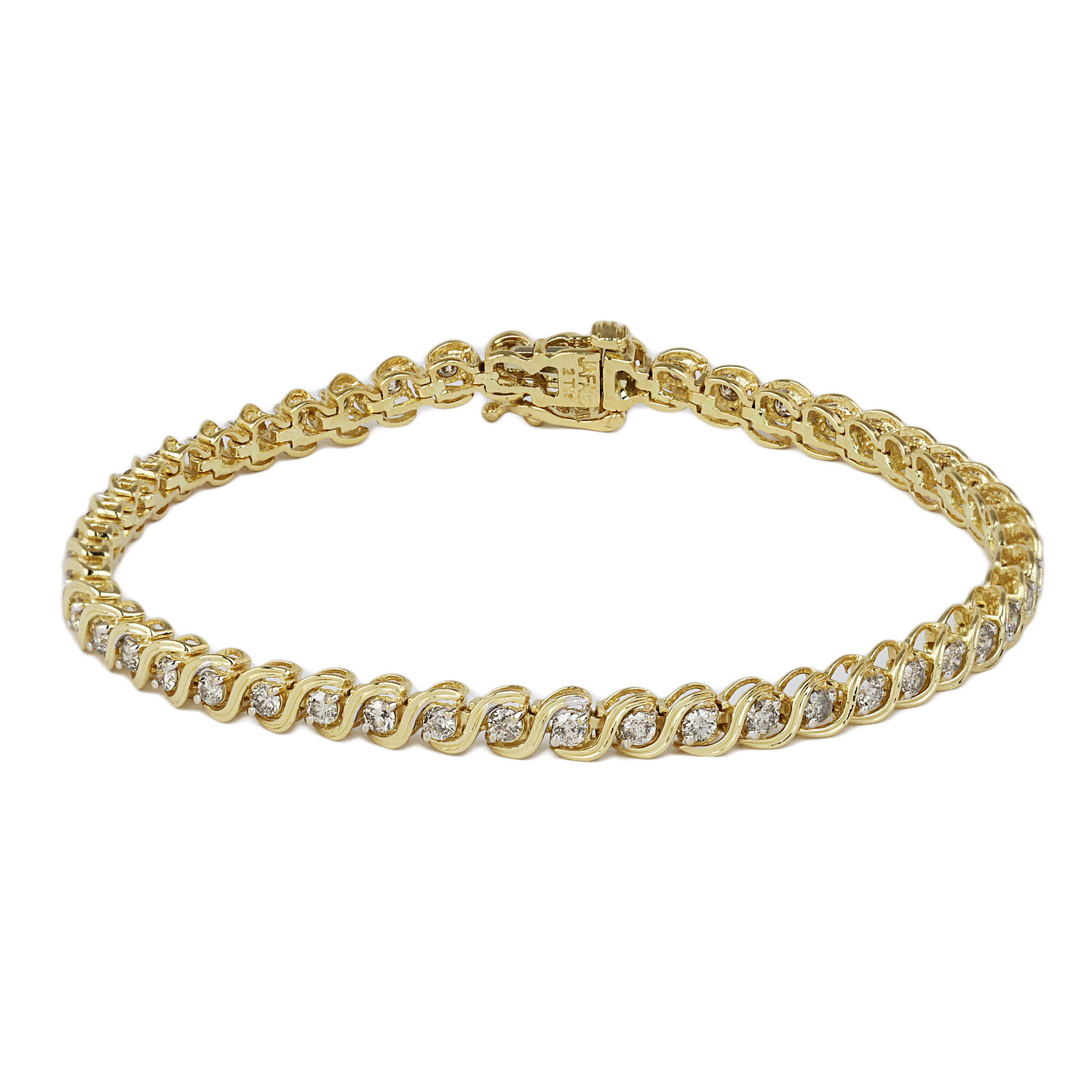 14k yellow gold bracelet with diamonds which amount to approximately 1.50 carat TW (I1 clarity/G-H-I color). It measures 7.5″ long, 4mm wide, and weighs 9.6 grams.