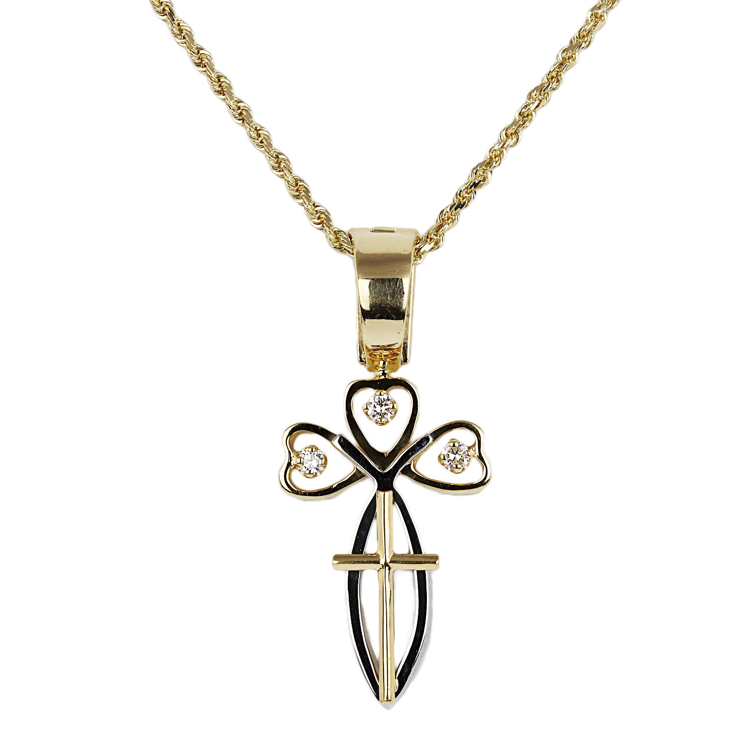 14k yellow gold necklace with a yellow and white gold enhancer cross pendant containing diamonds which amount to 0.15 carat TW (SI1-SI2 clarity/J-K-L color). The rope chain is 20″ long, the pendant measures 40mm tall, and total weight is 14.3 grams.
