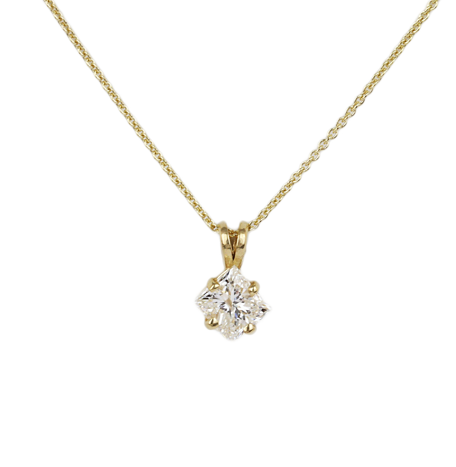 14k yellow gold necklace with a 0.70 carat princess cut diamond solitaire pendant (I1 clarity/G-H-I color). The chain is 16″ long, the pendant measures 11mm tall, and total weight is 1.9 grams.