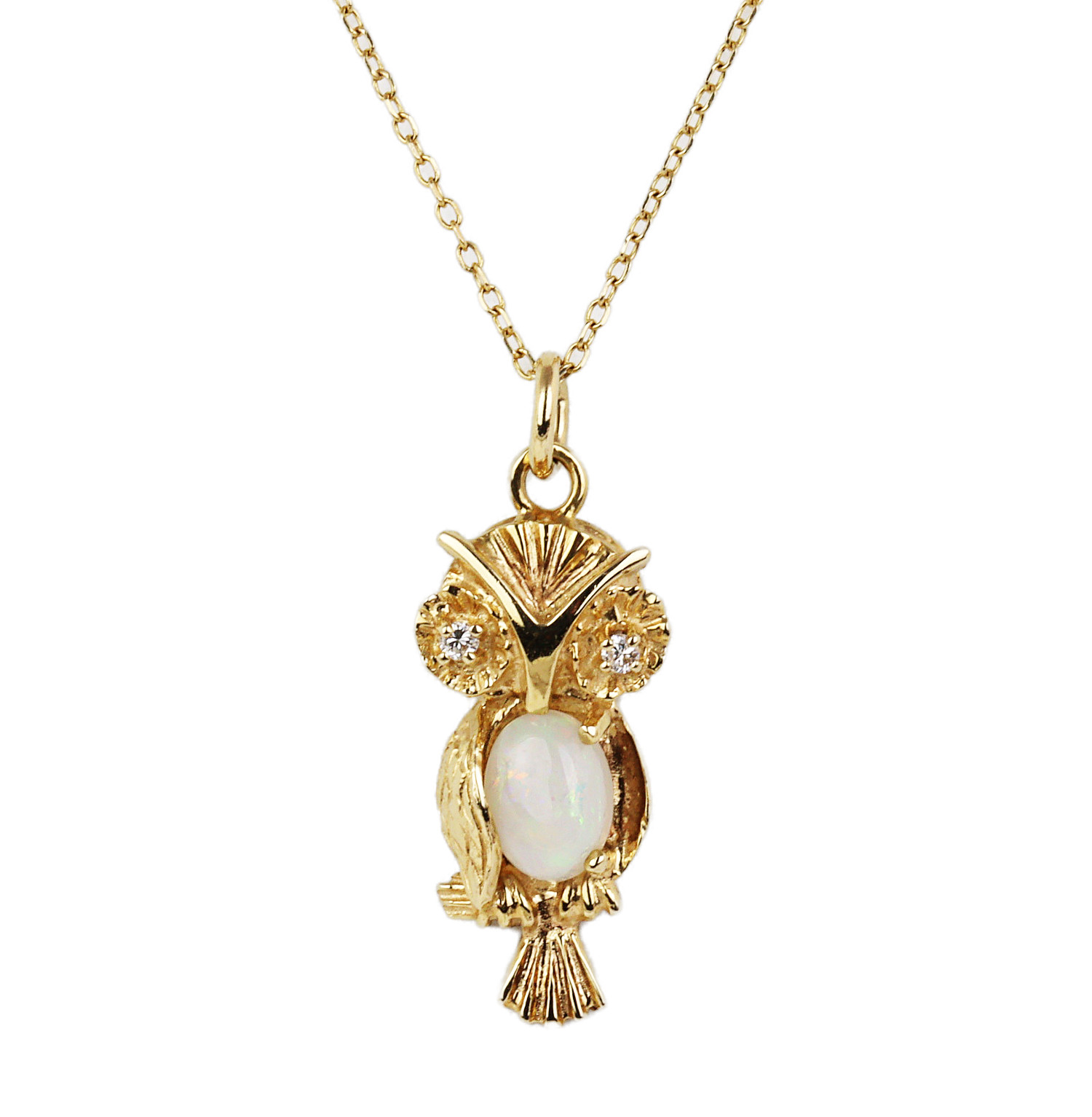 14k yellow gold necklace featuring an owl pendant containing a 6mm by 4mm opal stone and diamonds which amount to approximately 0.03 carat TW (I1 clarity/G-H-I color). The pendant measures 27mm tall, 10mm at the widest, the chain is 19″ long, and total weight is 3.3 grams.