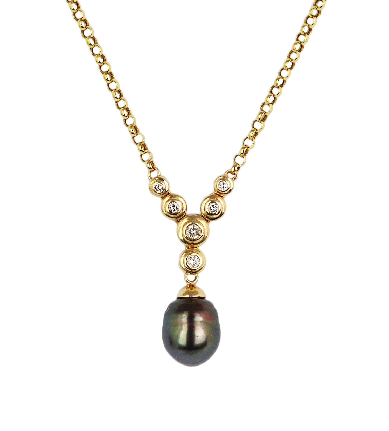 14k yellow gold necklace with a 12mm by 11mm pearl and diamond accents which amount to approximately 0.25 carat TW (I1 clarity/H-I-J color). The chain measures 16″ and weighs 6.8 grams.