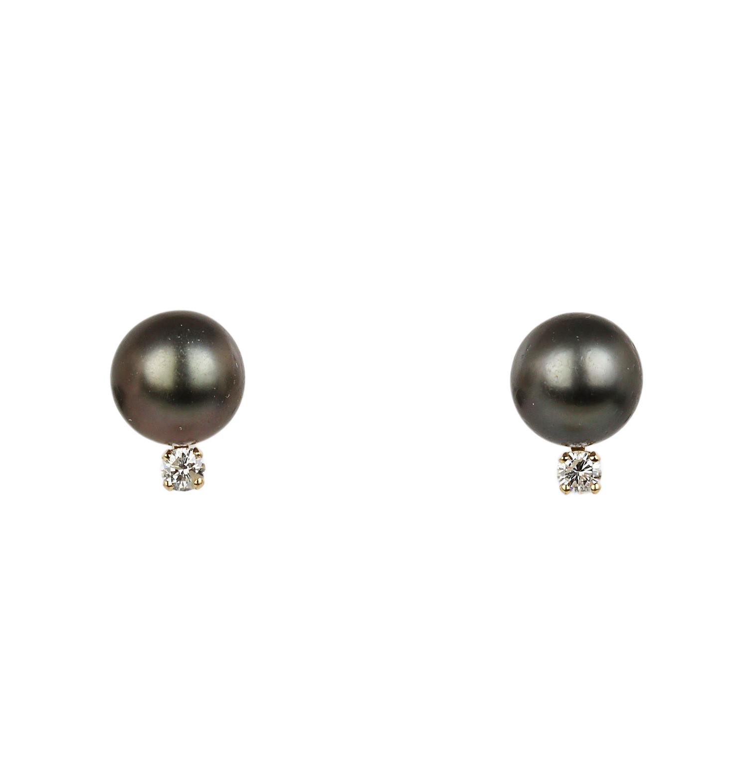 14k yellow gold stud earrings with black pearls and diamonds which amount to approximately 0.24 carat TW (I1 clarity/G-H-I color). They measure 12mm tall, 9mm wide, and total weight is 2.9 grams.