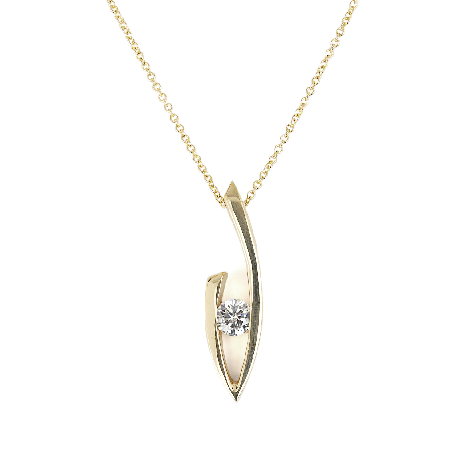 14k yellow gold necklace featuring a pendant that contains a 0.27 carat diamond (I1 clarity/G-H-I color). The pendant measures 26mm tall, 7mm at the widest, the chain is 18″ long, and total weight is 3.9 grams.