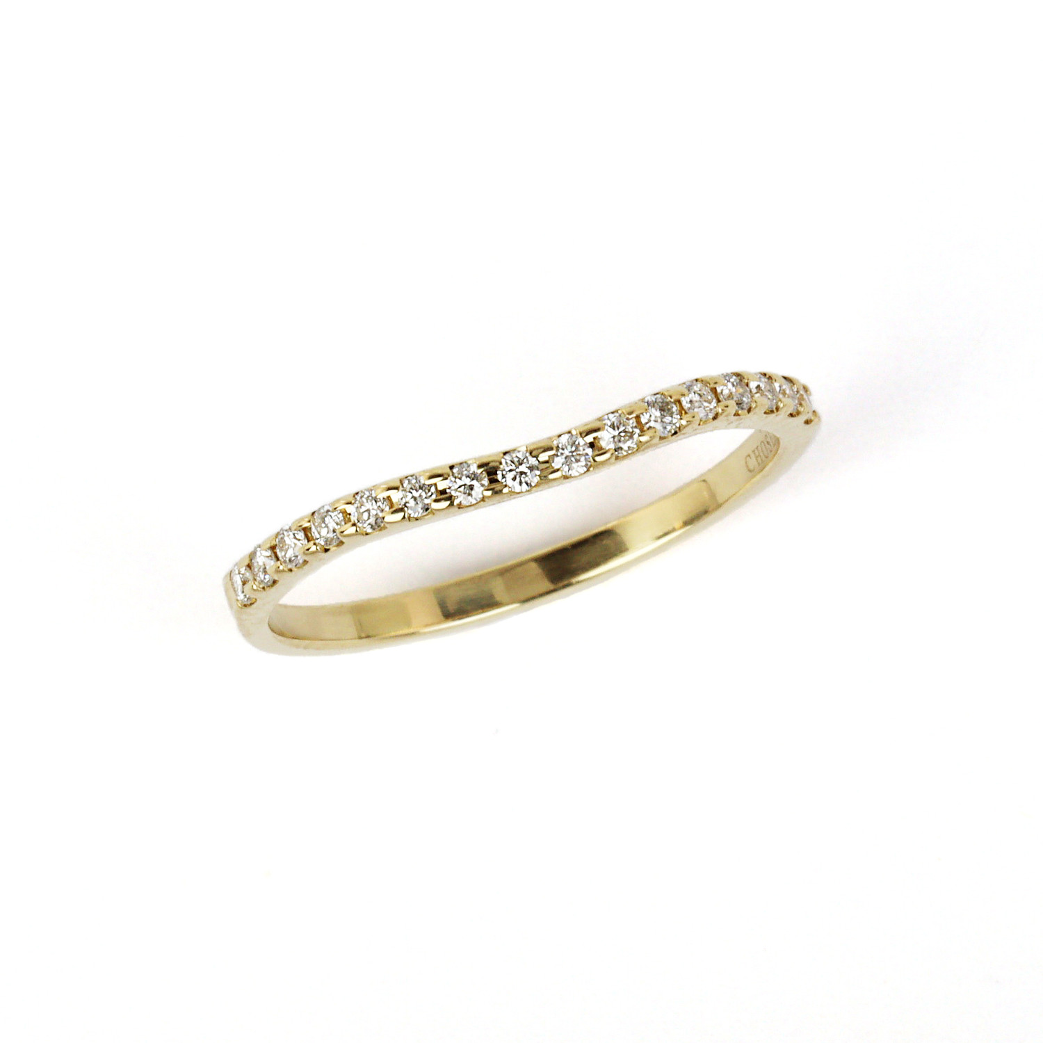 14k yellow gold band with diamonds which amount to approximately 0.16 carat TW (SI2-I1 clarity/G-H-I color). Fits a size 6.75 finger, measures 2mm wide, and weighs 1.4 grams.