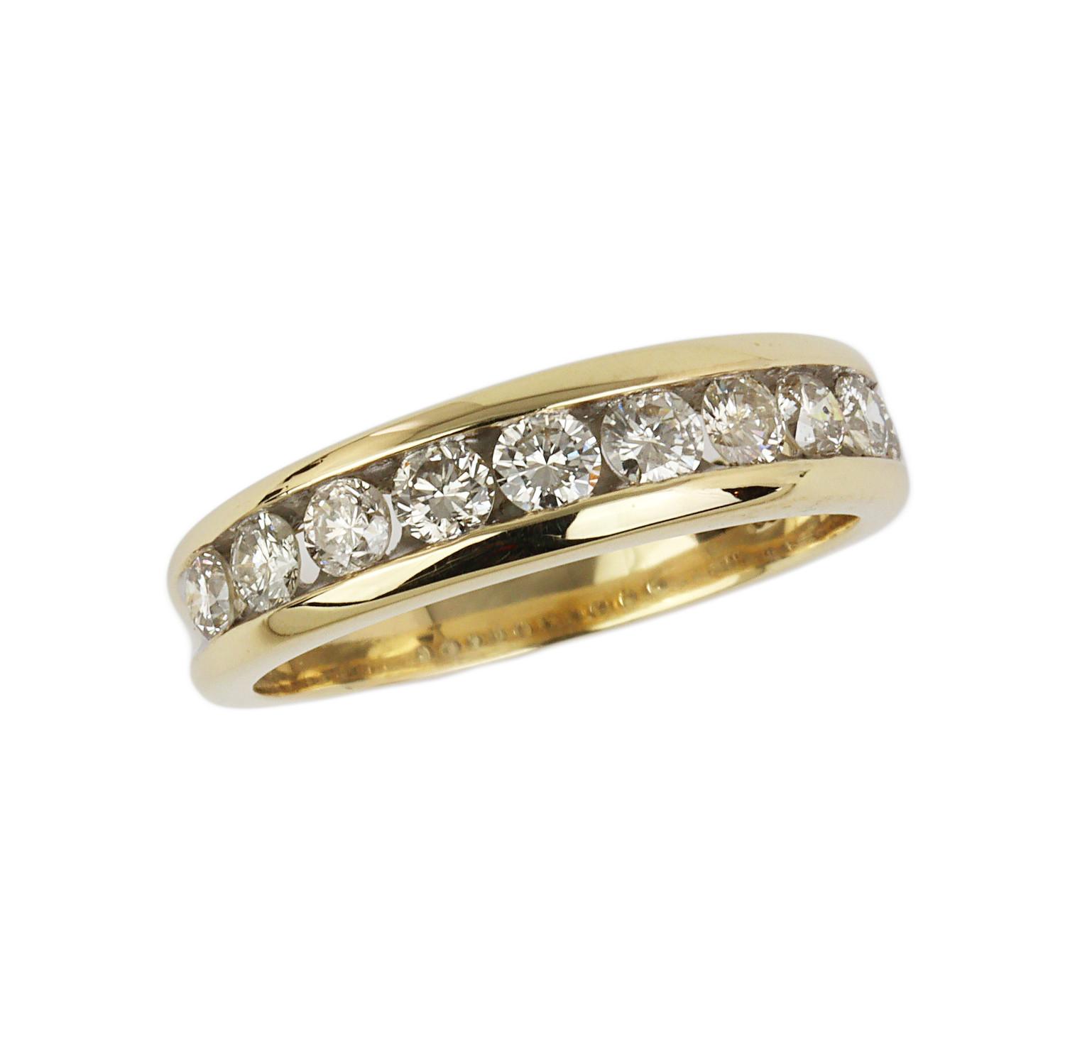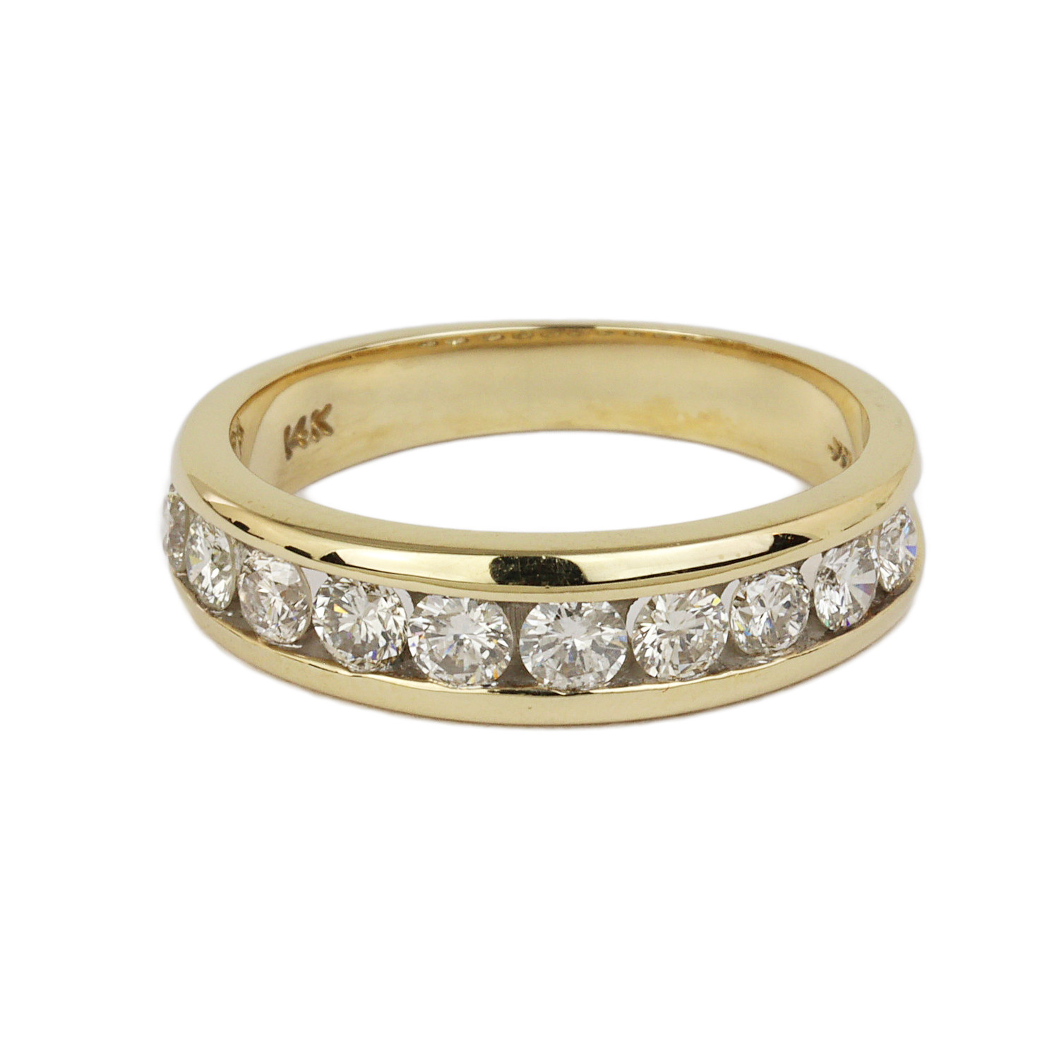 14k yellow gold ring with diamonds that amount to approximately 0.90 carat TW (SI2-I1 clarity/H-I-J color). Fits a size 8 finger, measures 6mm wide across the top, and weighs 4.9 grams.