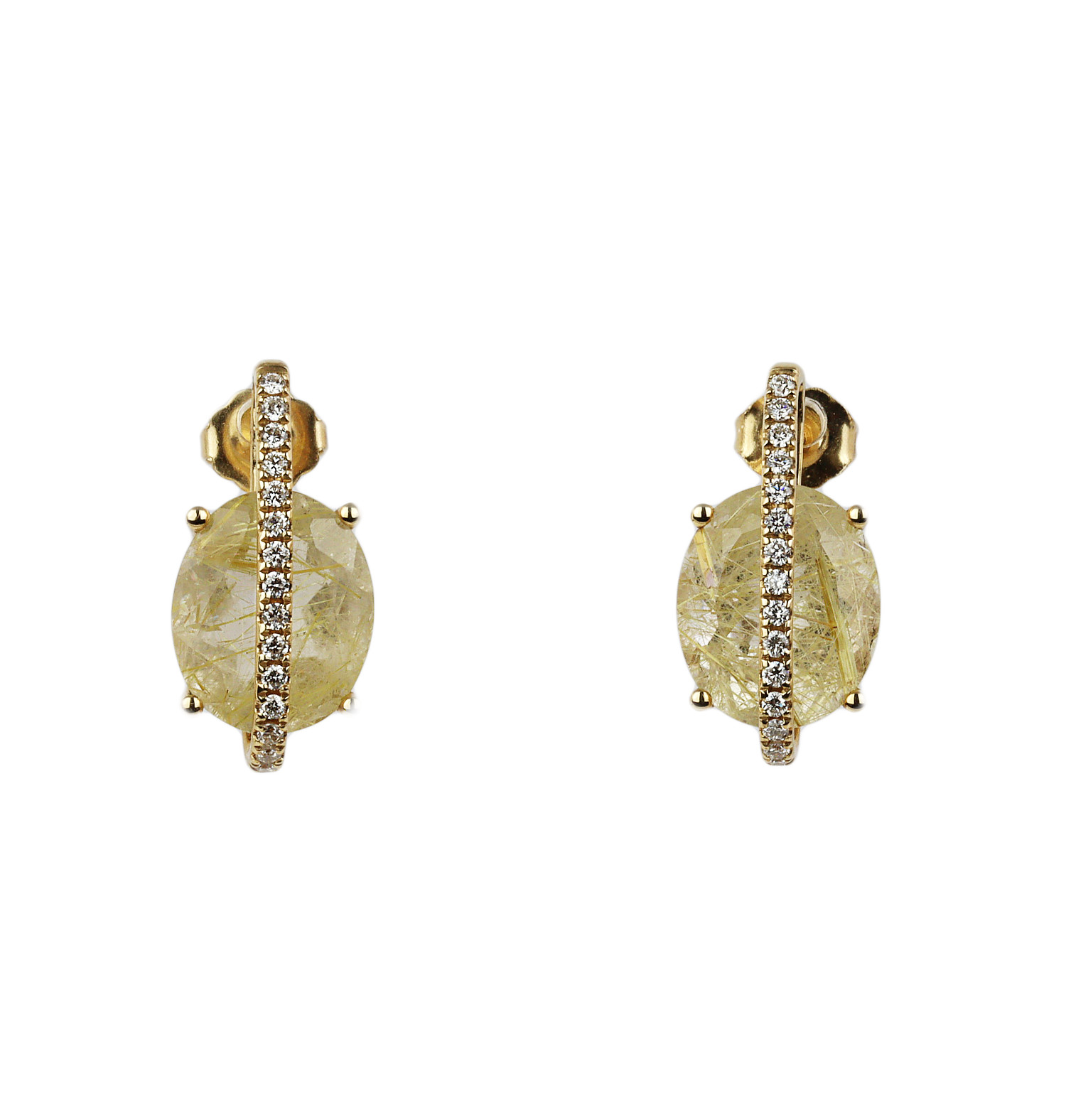 14k yellow gold earrings with rutilated quartz stones and diamonds which amount to approximately 0.29 carat TW (SI1-I1 clarity/H-I-J color). They measure 20mm tall, 10mm at the widest, and total weight is 5.3 grams.