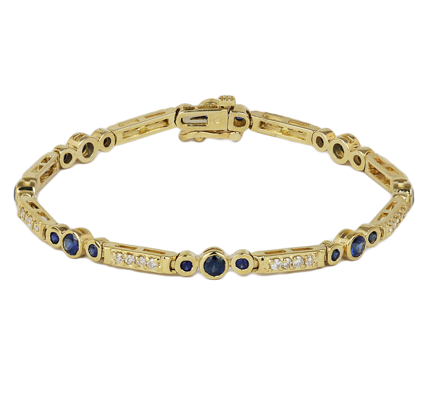 14k yellow gold bracelet with sapphire stones and diamonds which amount to approximately 0.55 carat TW (I1 clarity/G-H-I color). It measures 7″ long, 4mm wide, and weighs 11.9 grams.