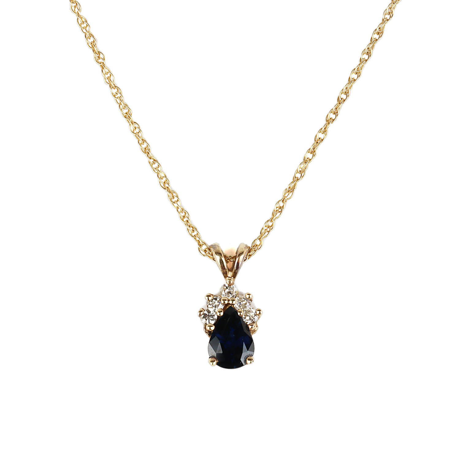 14k yellow gold necklace featuring a pendant containing a 6mm by 8mm sapphire stone and diamonds which amount to approximately 0.15 carat TW (I1 clarity/I-J-K color). The pendant measures 16mm tall, 8mm at the widest, the chain is 18″ long, and total weight is 3.1 grams.